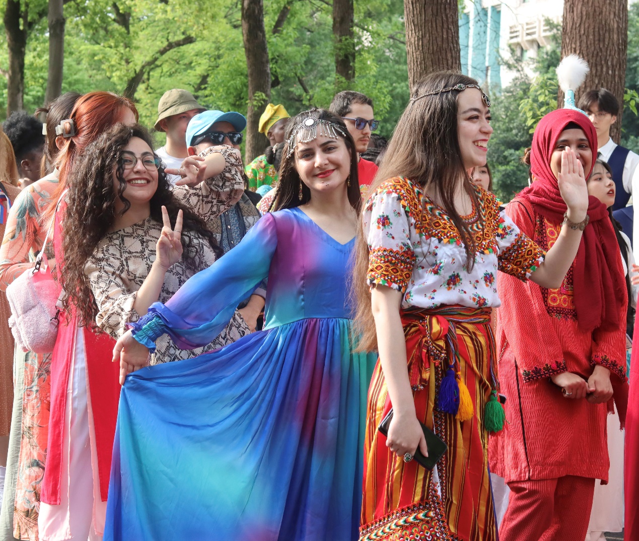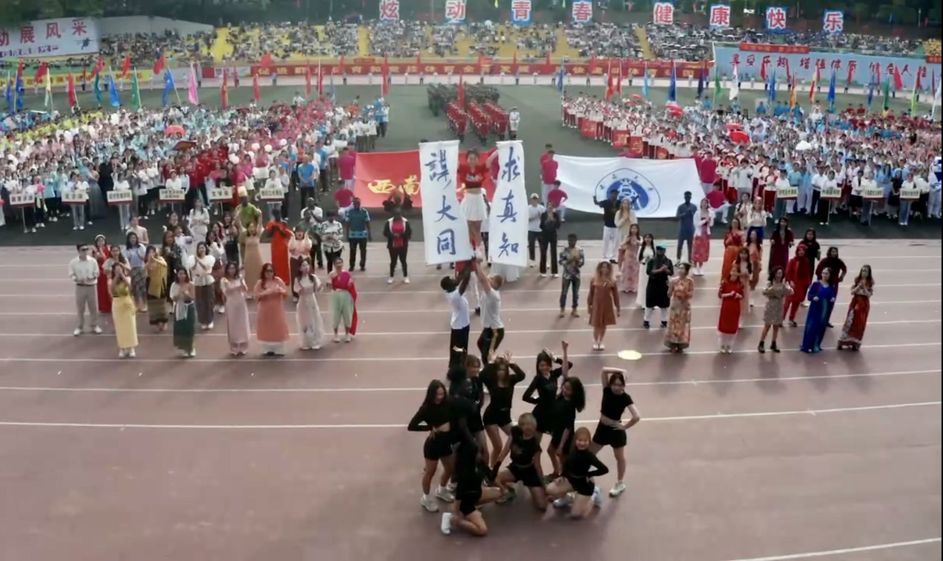 入场式在运动员进行曲中准时开始。在国旗队的引领下,各公司方阵迈着整齐的步伐相继亮相。公司方阵由60余名来自不同国家的员工组成,他们身着各自民族的传统服饰神采奕奕地阔步走来,在主席台前随着音乐节奏随心摇摆,尽情舞动青春,展现各国特色,最后以“求真知,谋大同”的院训精彩亮相,尽显风采,赢得观众席阵阵欢呼与掌声。