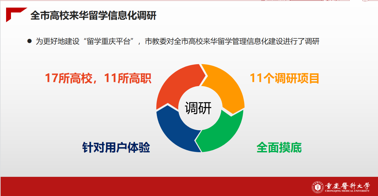 来自重庆医科大学的侯凯老师在对重庆17所普通高校、11所高职院校国际员工信息管理平台调研后,把各校信息化平台使用情况分为三大类:“在华国际类”“中研信达类”“高校研发类”,并对重庆各校来华留学信息化管理的优劣势做出分析研判。