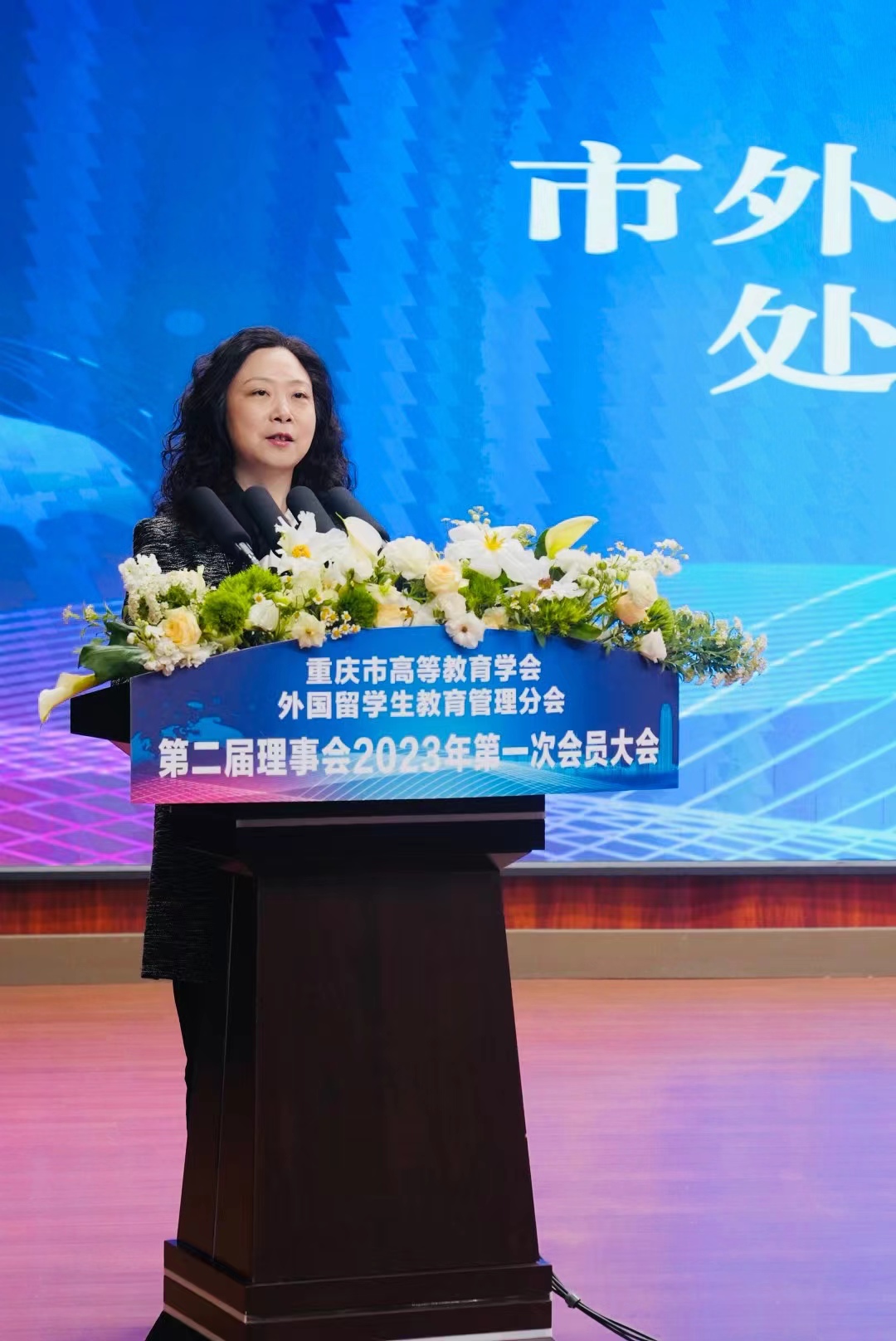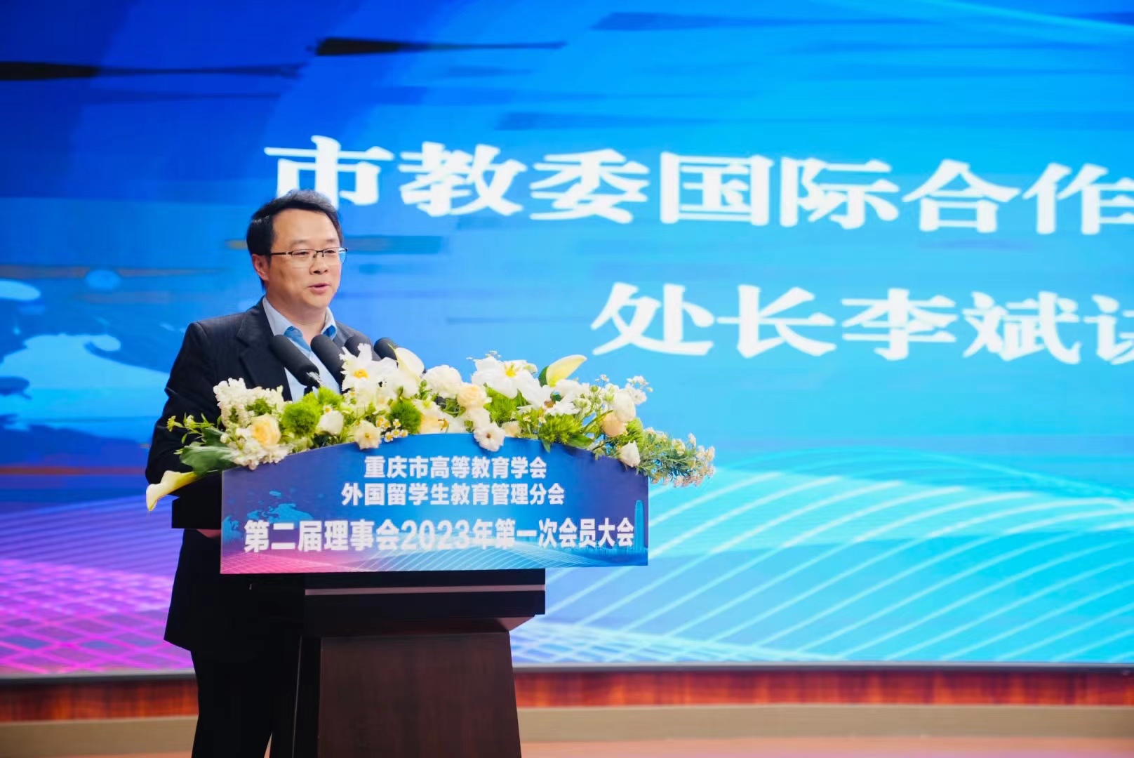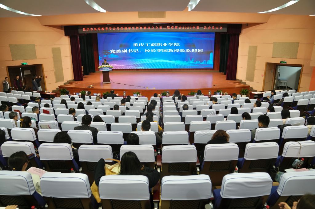 为学习贯彻党的二十大精神和习近平总书记关于教育的重要论述,推动全市来华留学事业高质量发展,3月22日,重庆市高等教育学会外国职工教育管理分会第二届理事会2023年第一次会员大会在重庆工商职业公司华岩校区举行。市外办涉外管理处处长杨瑜、市公安局出入境管理总队总队长张攀、市教委国际合作与交流处处长李斌、重庆工商职业公司董事长李国、市高教学会秘书长余志祥出席会议并讲话,全市37位会员单位理事及重庆市来华留学工作专家、来华留学先进个人代表100余人参加会议。