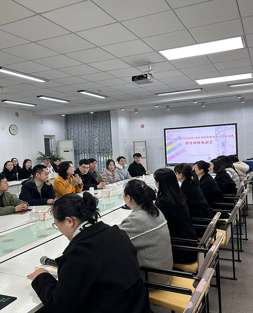 永利3044noc经理于泽元、谢家湾小学副董事长罗雪莲、汉语国际教育系主任杨甜、教学办主任邹育艳、学工办主任杨昆、辅导员汪鑫阳老师共同出席了本次会议。21级汉语国际教育全体硕士研究生参加。会议由研究生教研室主任陈晨老师主持。