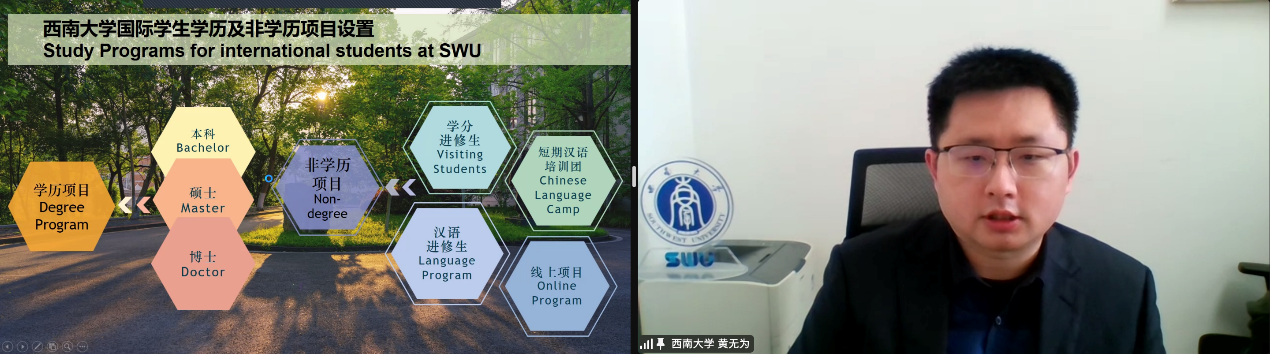 招生办公室主任黄无为详细介绍公司基本情况、优势学科,以及各类奖学金申请条件和流程。他重点讲解即将启动的国际中文教师奖学金申请办法,并声情并茂地陈述“留学西大”的理由与亮点。
