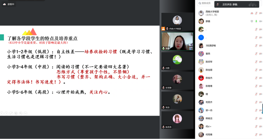 廖鑫老师从实习的前期准备、实习过程的具体内容、实习结束后的信息获取三个层面展开分享,通过大量具体的案例和相关图片生动形象地给予了建议。以实习前需准备好的物品和需具备的心态出发,提醒各位即将迈入实习阶段的同学们主动了解各学段的员工特点及培养重点,并强调小学、初中和高中三个学段是一脉相承的。她向同学们强调实习期间需要“避雷”的地方,从多看、多听、多问和多反思入手,做一位让员工信服,兼具包容性和丰厚学识魅力的教师。同时,她还为同学们提供各学段的优质备课资源,用真实案例讲述如何与员工及员工家长建立信赖感,有理有据,令人信服。最后,廖老师提示同学们要长期保持和实习公司的紧密联系,为就业求职打牢基础。