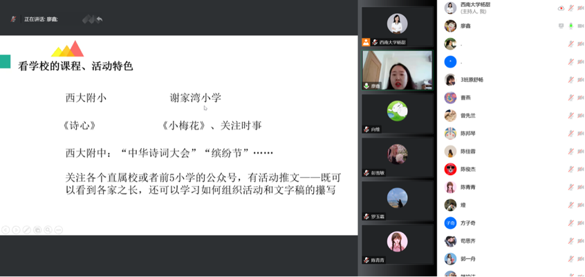 2023年1月3日上午10时,“缙云知华”大讲坛学术沙龙第十五期通过腾讯会议举办,该讲座聚焦专业实践,主题为“实习中那些你不知道的秘密”。公司附属中学语文高级教师廖鑫受邀主讲,公司汉教系主任杨甜主持讲座,70余名硕士生在线学习。
