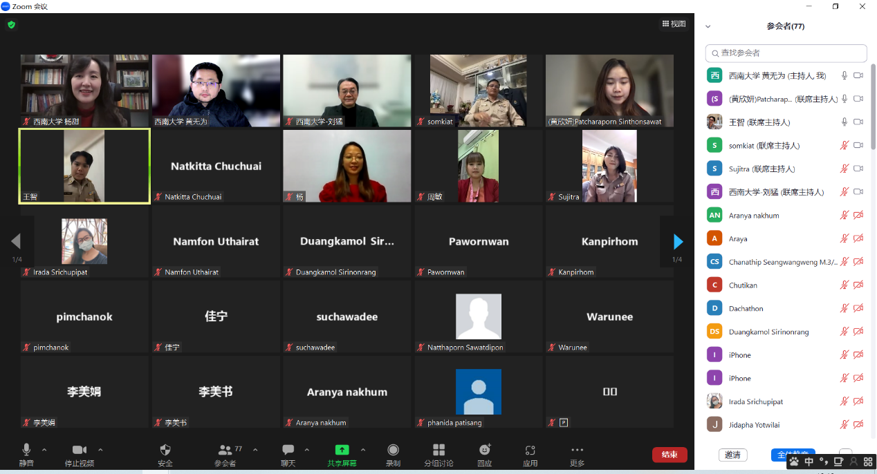 12月19日北京时间晚7点,2022年冬季汉语桥“玩转汉语,云游中国”中员工线上项目正式开营。国际公司党委书记刘猛、汉语国际教育系主任杨甜,泰国佛统府伟赉恳中学董事长Mr.Somkiat Pathummasut,副董事长Sujittra Khammewat以及近80名该校师生参加开营典礼。仪式由项目负责人黄无为主持。