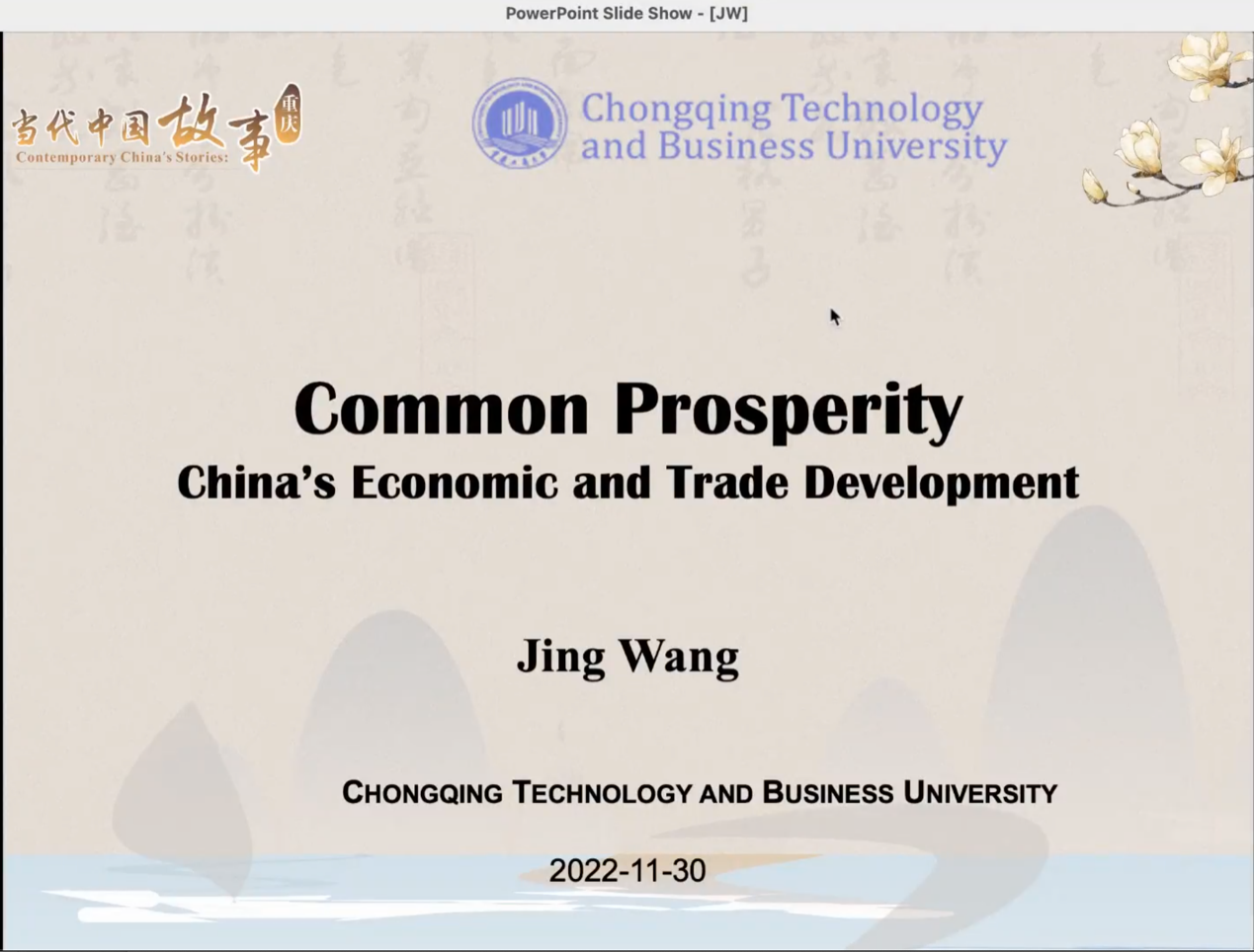 为积极贯彻落实党的二十大关于“向世界讲好中国故事”的号召,2022年11月30日下午3:00,“缙云知华”大讲坛专家讲座第十二期在重庆工商大学成功举办,主题为“共同富裕—中国经济与贸易发展”,讲座由重庆工商大学经济公司王静副教授主讲,国际合作与交流处处长张轶主持。受疫情影响,讲座以线上形式展开,重庆工商大学国际员工和部分中国员工代表、在渝其他高校国际员工通过腾讯会议线上参加讲座。