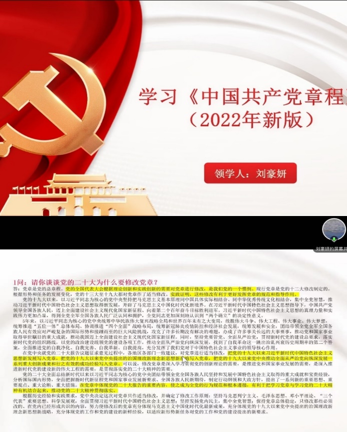 预备党员刘豪妍同志领学《中国共产党章程》,重点对修改的条文进行逐条讲解。
