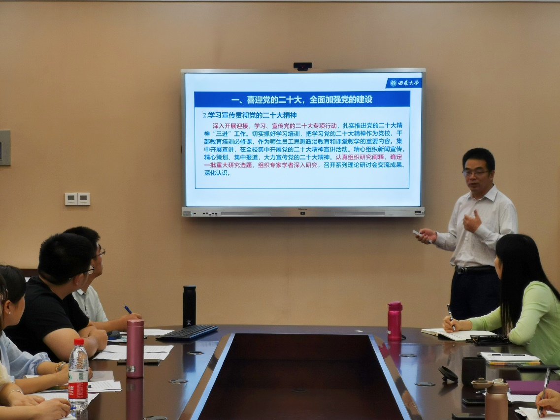 王鹊导学习近平总书记在省部级主要领导干部“学习习近平总书记重要讲话精神,迎接党的二十大”专题研讨班上的重要讲话精神;黄无为导学习近平总书记给北京师范大学“优师计划”师范生的重要回信精神;翟二猛组织观看《新闻联播》系列片《领航中国》。最后,冯换叶、黄无为组织趣味问答,检验本次政治理论学习成效。