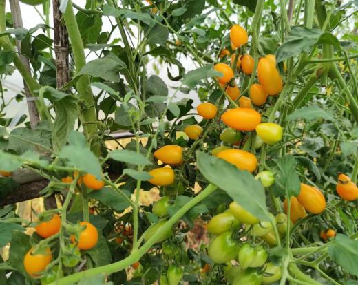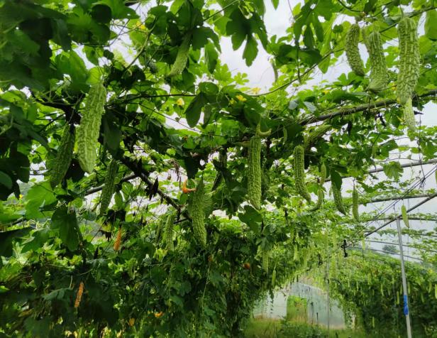 受其地形影响,璧山在大规模蔬菜机械化生产方面受到限制,因此当地转变策略,走出了一条因地制宜的多样化农产品的生产道路。走进蔬菜园区后,我们观察到一排排白色透明大棚里种植了许多应季的蔬菜,如番茄、茄子、苦瓜、南瓜、丝瓜、豇豆等等,有刚开花的,有刚结果的,还有的已经成熟,农人正在采摘。印象最深的是大棚里的番茄,有金黄的、血红的、淡粉的、迷彩的、透绿的颜色,鲜艳欲滴,美不胜收;有的似馒头般的硕大,也有的似葡萄般袖珍可爱,总之,各有千秋。入口后,汁水爆满口腔,各色番茄在饕客嘴里上演出一场美食盛宴。