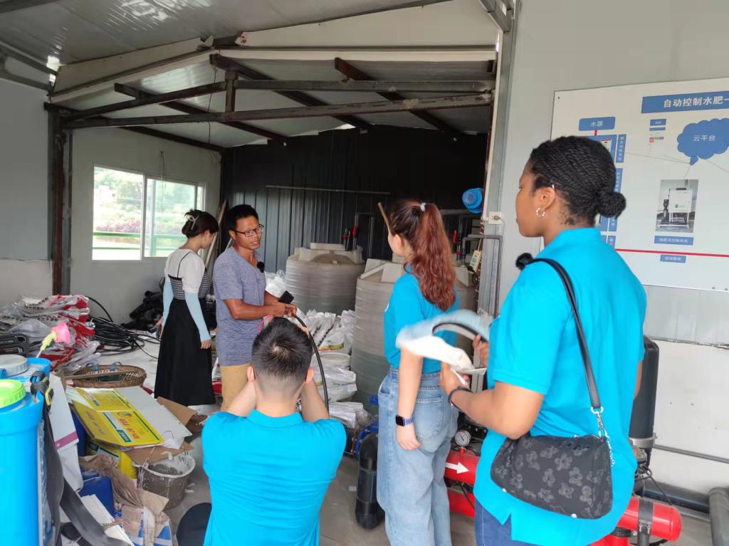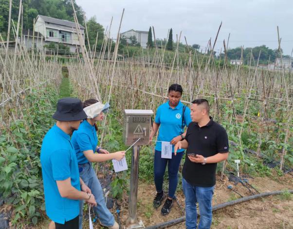 实践队一边参观,一边驻足向两位老师请教。曾永江老师从土壤改善技术、选育种技术、蔬菜嫁接技术、病虫害防治技术和灌溉系统,有机垃圾无害化处理技术等方面为我们调研团队做了既通俗易懂又充满趣味性的介绍,大家听后连连赞叹,罗老师时不时进行适当补充,氛围十分愉快。为了更加清楚农业科技的运用,曾老师现场为实践队展示如何在手机上远程操作农业灌溉系统,解说农业精细化管理流程。田间建有小型气象预测站、水肥一体化设备,和物联网环境检测设备,因此农业管理者只需打开手机就可以一键解锁气温、土壤湿度等,管理系统将根据环境检测情况自动显示施肥、浇水的时间,因此,足不出户就可以管理农田,大大节省了人力。信息技术在农业领域的应用,将手机功能发挥得淋漓尽致,使之成为“新农民”手中的“新农具”,也正是这些基础设施的完善,使得数字赋能农业才取得如此成效。