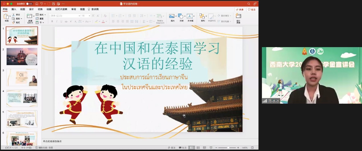 最后,公司在华职工李佩英(Ms. YAOWAPA SANGJAN)结合丰富的视频、图片,生动全面分享了自己在华留学和生活;在泰职工陈冰冰(Ms. CHAYAKAN SAENCHAN)则展示疫情下公司如何帮助大家更好地完成线上学习,开展生涯指导和心理疏导等,消除大家申请留学的疑虑。