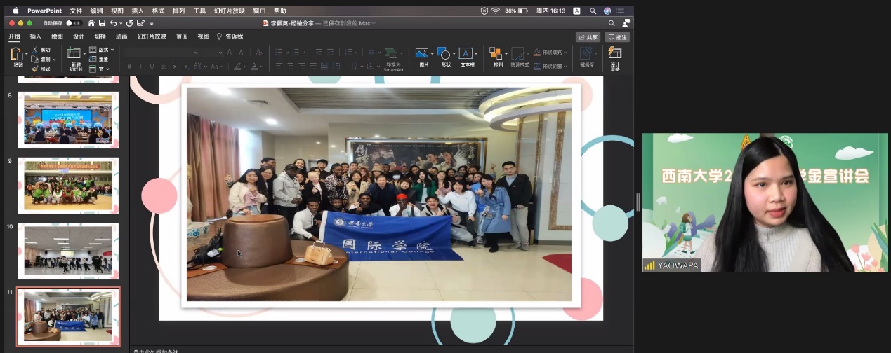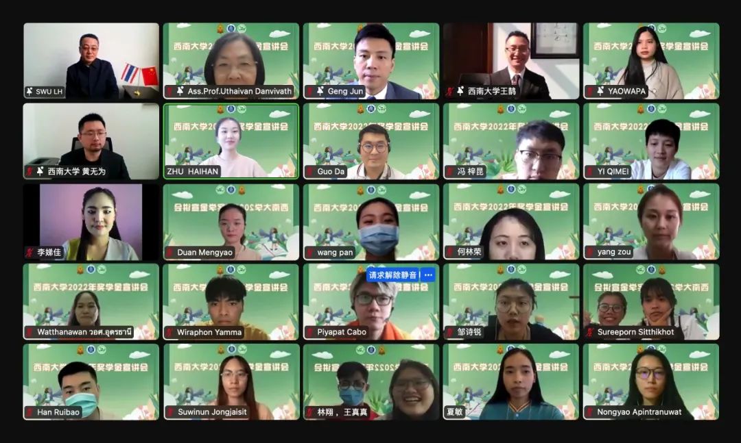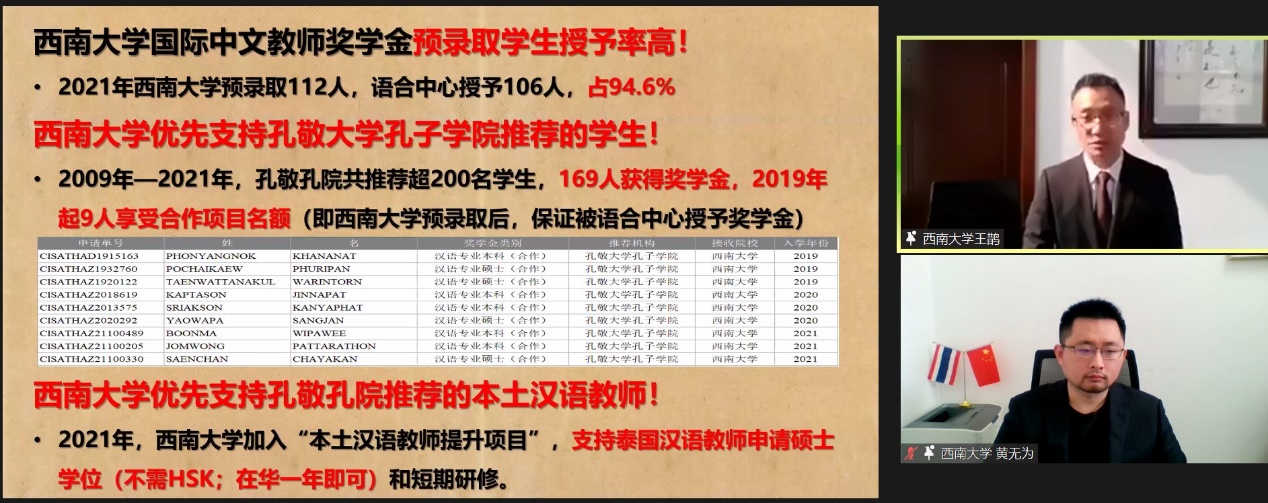 招生项目负责人办详细地讲解公司办学优势学科,中国政府、国际中文教师、重庆市长、公司新丝路及董事长等奖学金的申请条件和流程,重点介绍即将启动的国际中文教师奖学金及泰国同学选择永利3044noc的四大理由,并在互动环节就申请成功率、线上学习及奖学金发放、勤工俭学等方面的问题进行解答。