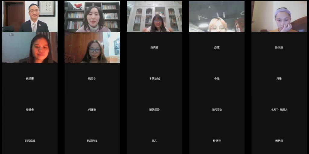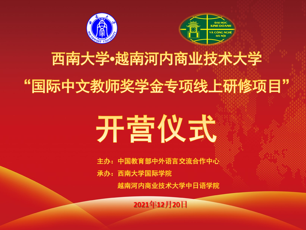 2021年12月20日晚7点,“永利3044noc·越南河内商业技术大学国际中文教师奖学金专项线上研修项目”正式开营。国际公司党总支书记刘猛和越南河内商业技术大学中文系国际交流负责人阮氏芳英出席活动并讲话,汉教系主任杨甜和3名任课教师,以及全体28名越南老员工参加仪式。仪式由项目负责人王鹊主持。