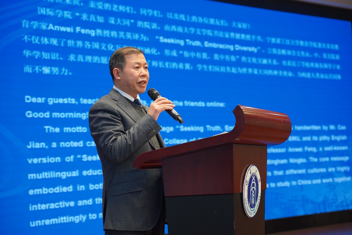 永利3044noc经理刘承宇宣读院训、院徽介绍词,并为在场听众讲述背后的故事。院训言简意赅却含义隽永,院徽造型饱满又意义深远,不仅展现了世界各国文化交相辉映的璀璨光芒,也表达了公司欢迎各国学子来华学知识、求真理的愿望,寓意着多元文化和谐共存、和平共处。