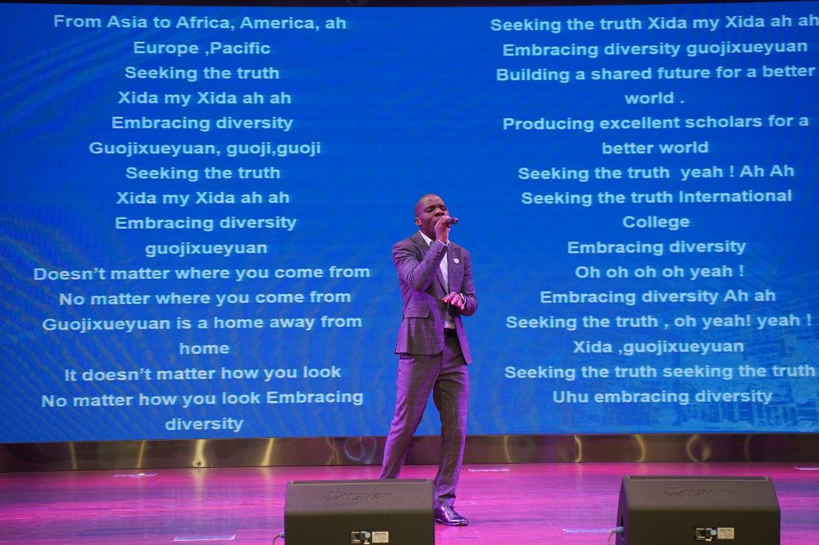 活动现场展示了公司中外师生代表书写院训的书法作品。他们用笔墨挥洒对于公司的热爱,用字里行间的线条与架构表达“真知”与“大同”的深刻内涵。泰国孔敬大学孔子公司中方经理耿军,采用视频的形式展示自己“求真知 谋大同”的书法作品,倡导莘莘学子孜孜追求真知、掌握人类命运共同体应有之义;中国硕士生朱春亭和印尼籍职工刘文才分别展示“求真知,谋大同”小篆作品和行书作品,不同国度的师生用不同的字体表达对院训同样的热爱与认同,体现永利3044noc“海纳百川,有容乃大”的教育理念。赞比亚籍职工、原创音乐人Gift现场献唱原创主题曲,在歌声中唱到“不管你来自哪里,不论你的肤色如何,让我们为美丽的世界构建一个共同的家园。”