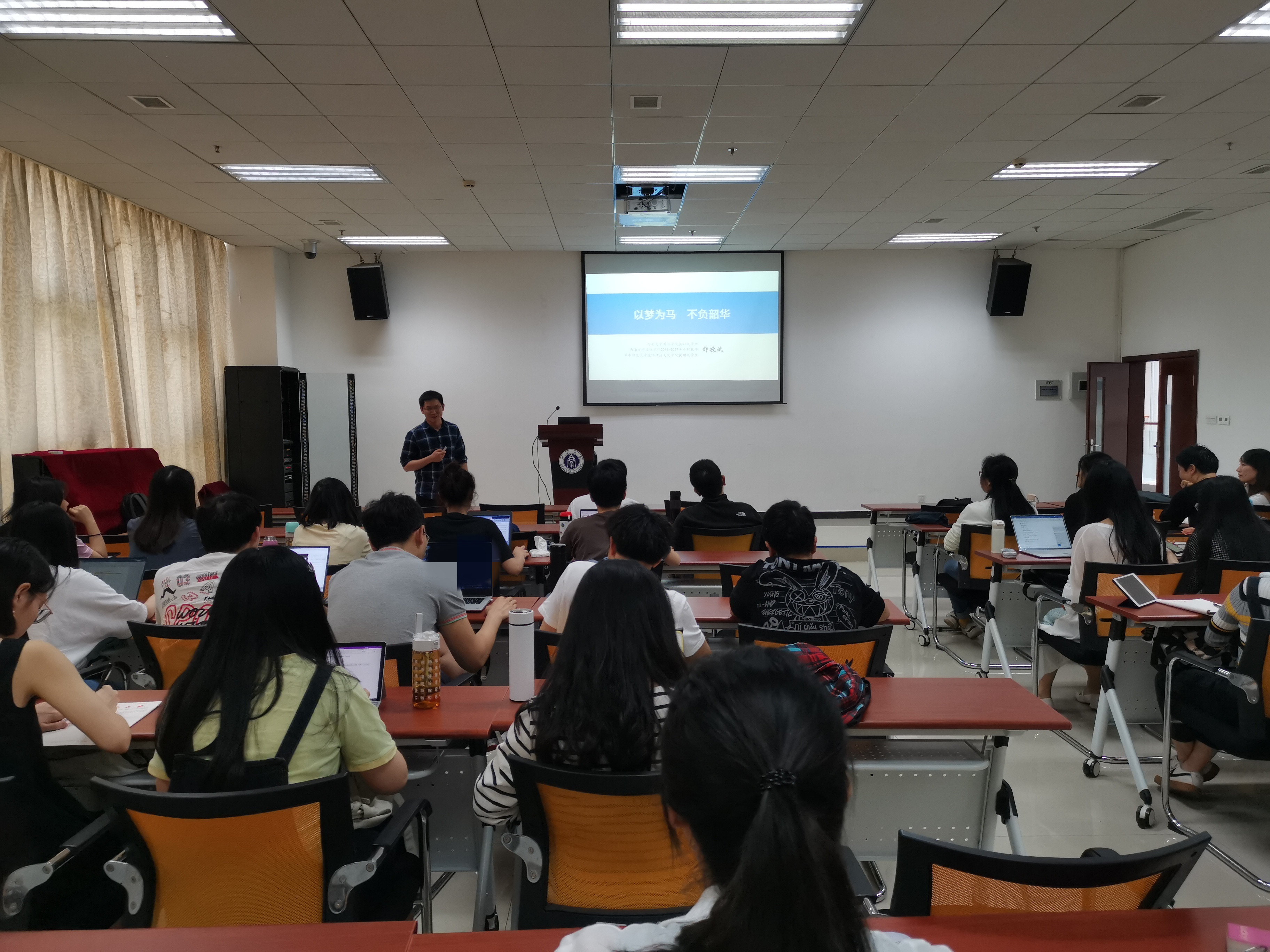 舒敬斌博士以“以梦为马,不负韶华”为题,引用《论语·为政》“吾十有五而志于学,三十而立,四十不惑”导入话题,结合个人经历,针对就业指导、科研方法、读博攻略、人生规划四个方面进行了详细阐述,既有宏观的指导性意见,又有微观的可行性操作,提醒同学们坚守信念,保持奋斗精神,戒骄戒躁,事缓则圆。在舒敬斌博士展开的时间线里,我们见证了他从本科到博士的完美蜕变,其间学习的艰辛以及人生转折点的关键选择也引发了群体共鸣。
