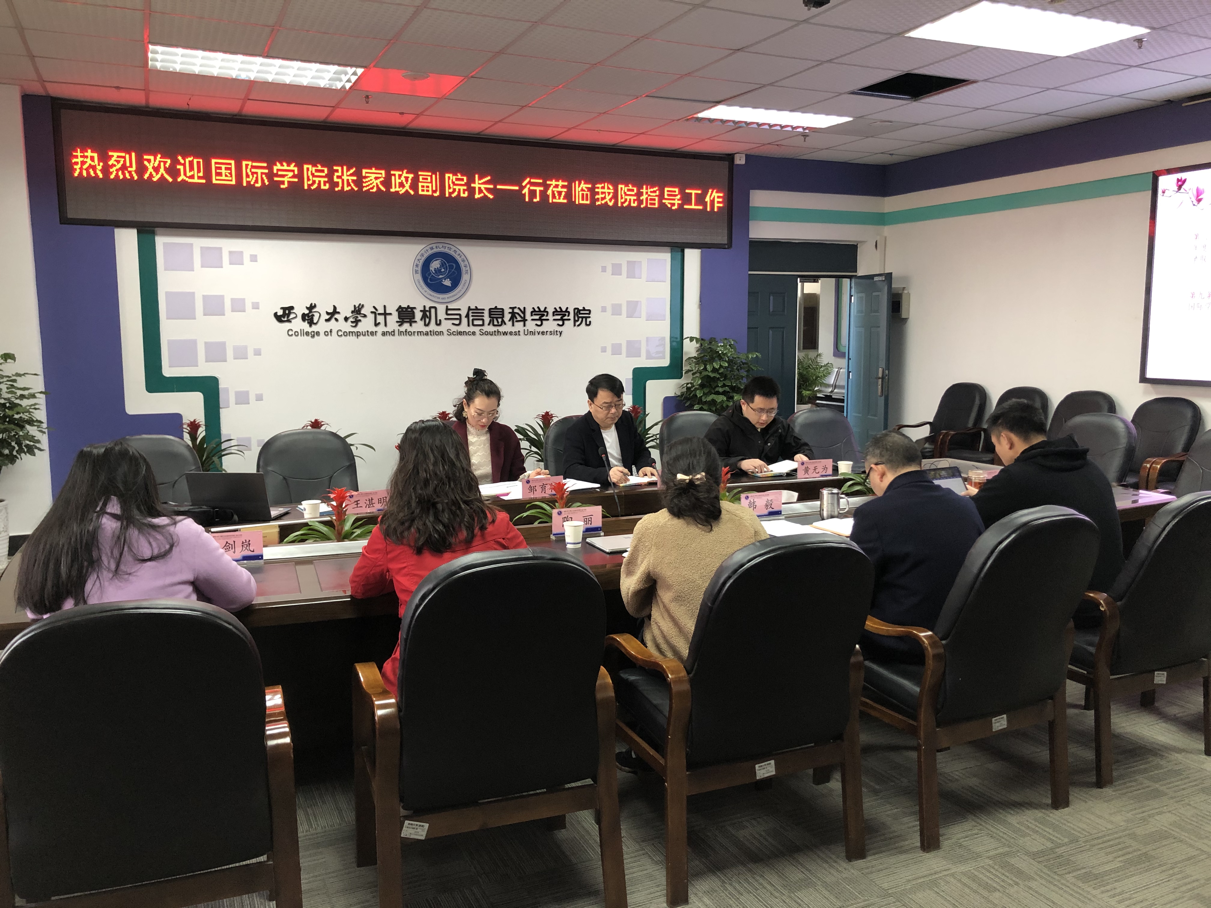 为加强与二级培养单位的沟通与联系,进一步做好来华留学教育工作, 3月24上午,副经理张家政带领公司招生办、教学办、学工办有关工作人员前往计算机与信息科学公司/软件公司调研,计算机与信息科学公司/软件公司副经理韩毅、副经理陶丽、副书记陈智和有关辅导员、外事秘书、教学秘书等参与座谈交流。