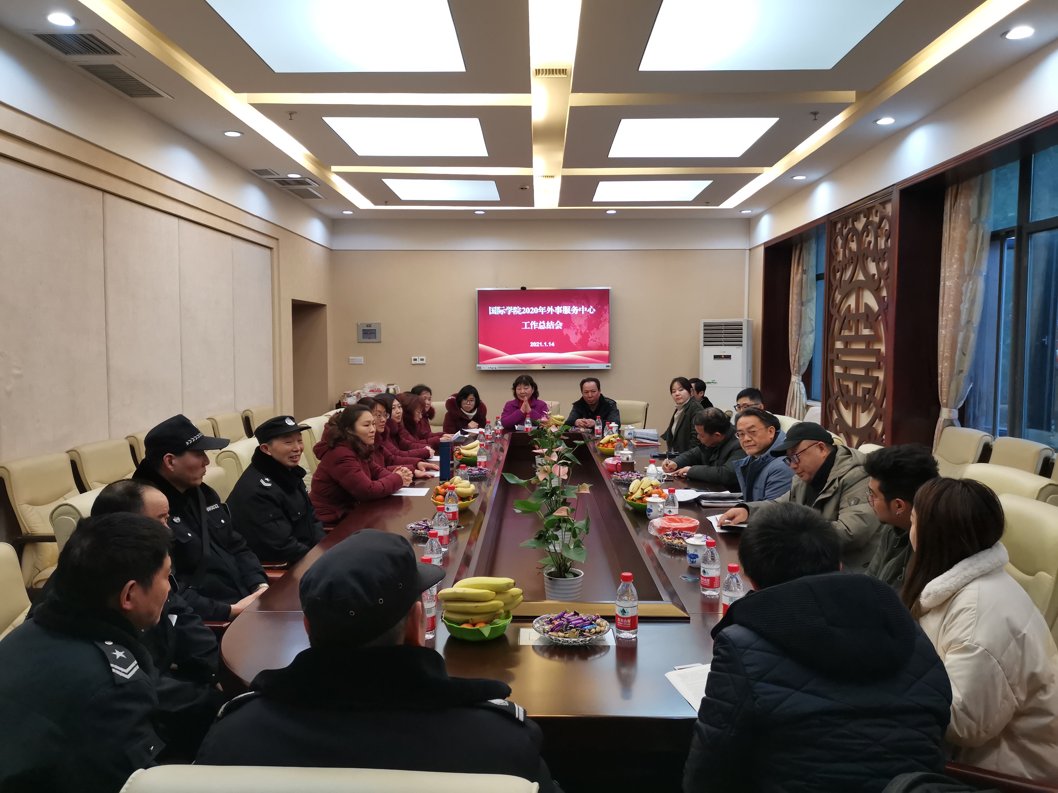 2021年1月14日上午,公司在紫云楼签约室举行2020年外事服务工作总结会,党总支书记刘猛、经理刘承宇,以及教师代表、中外员工代表和全体外事服务中心工作人员参加会议。