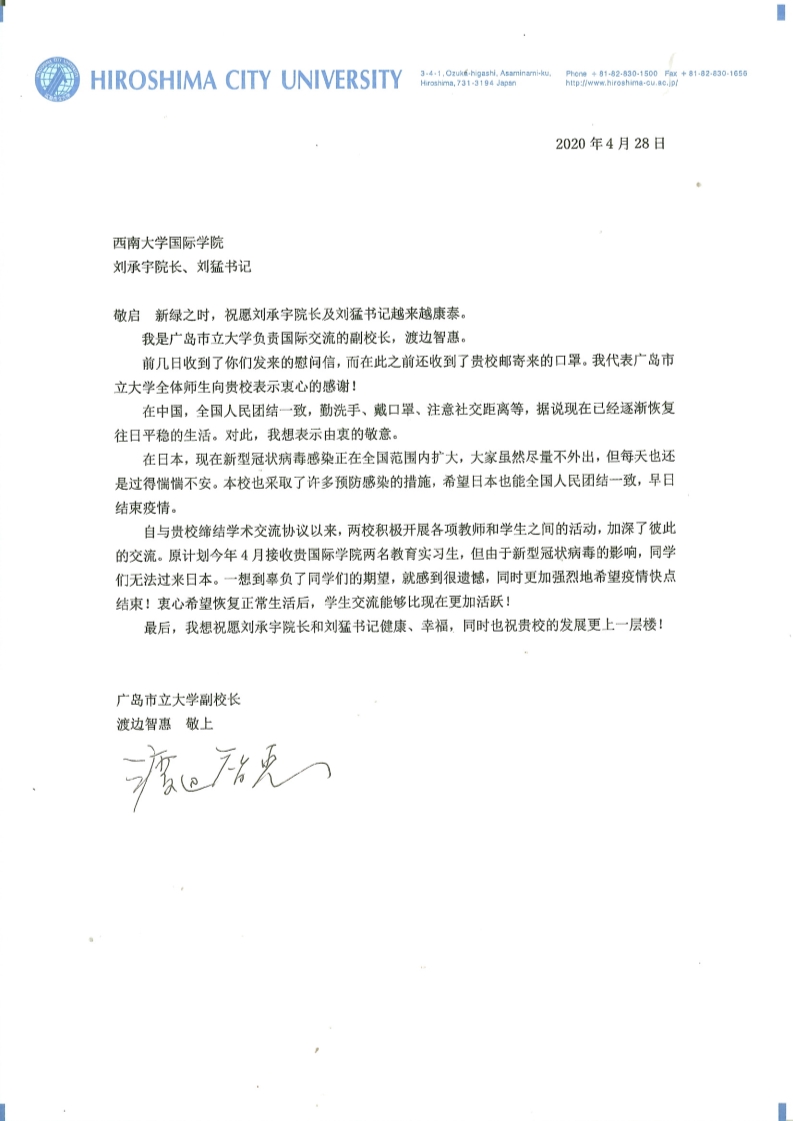 日本广岛市立大学副董事长渡边智惠在回信中表达了深深的谢意。指出,日本全国人民包括该校都采取了多种预防感染的措施,目前正在团结一致积极抗击疫情。渡边董事长还对因疫情影响无法于今年4月赴日本实习的公司两名员工表达了遗憾,希望疫情结束后两校在员工交流方面能更加活跃。