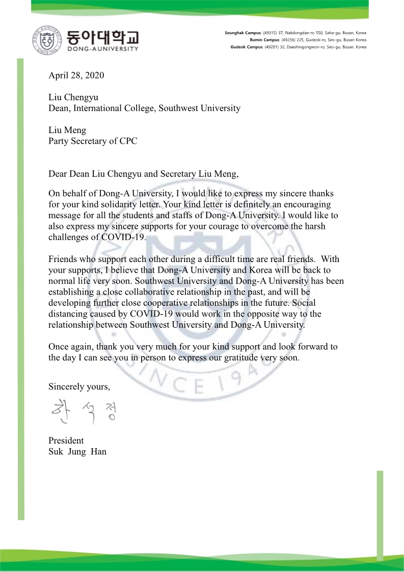韩国东亚大学董事长韩锡政先生对公司表示感谢并对公司战胜疫情的严峻挑战表达敬意。强调,在困难时期相互扶持的朋友才是真正的朋友,相信两校将保持并进一步发展紧密的合作关系,两校的友谊将因共同面对此次挑战而变得更加深厚牢固。