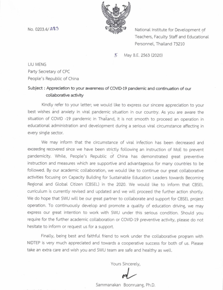 泰国行政管理公司经理萨玛纳堪 • 薄倰先生在给公司的回信中,表达了对中国抗疫取得伟大胜利的钦佩之情。表示,在泰国人民的共同努力下,最新感染人数已经呈现下降趋势,在抗疫过程中借鉴了宝贵的中国经验。期待在疫情结束后,双方继续实施已成功举办的三届泰国董事长及教育官员培训项目,进一步拓展双方合作领域,开展更多务实合作。