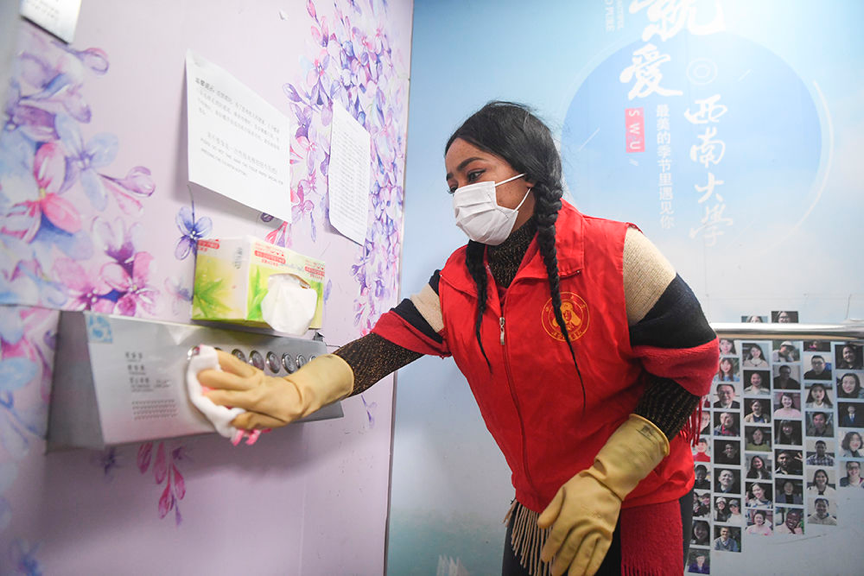 2月18日,24岁的永利3044noc尼日利亚籍职工志愿者方雯在对电梯按钮进行卫生消毒。