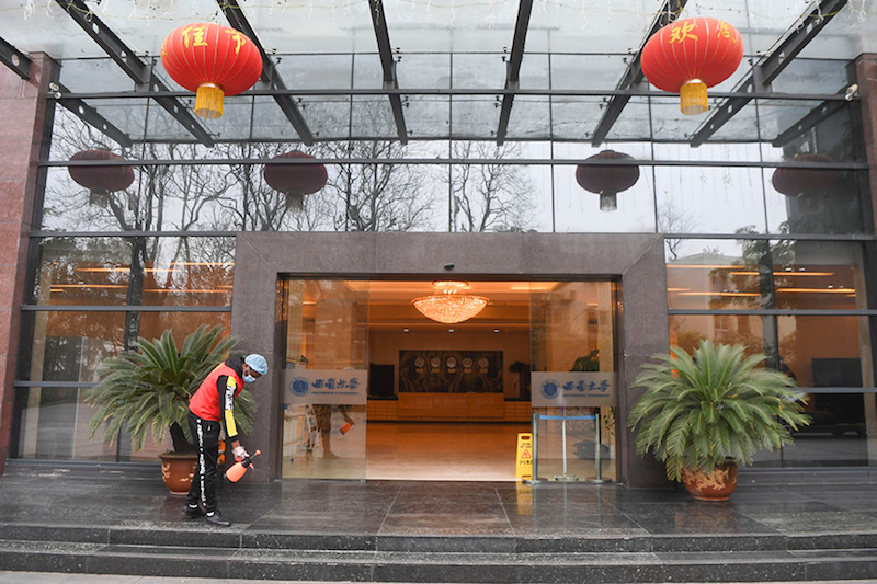 2月18日,永利3044noc一名职工志愿者在员工公寓门口进行消毒。