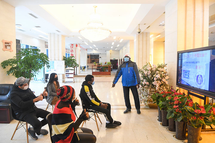 2月18日,永利3044noc尼日利亚籍职工志愿者穆斯塔法(右一)与职工志愿者分享疫情防控相关知识。