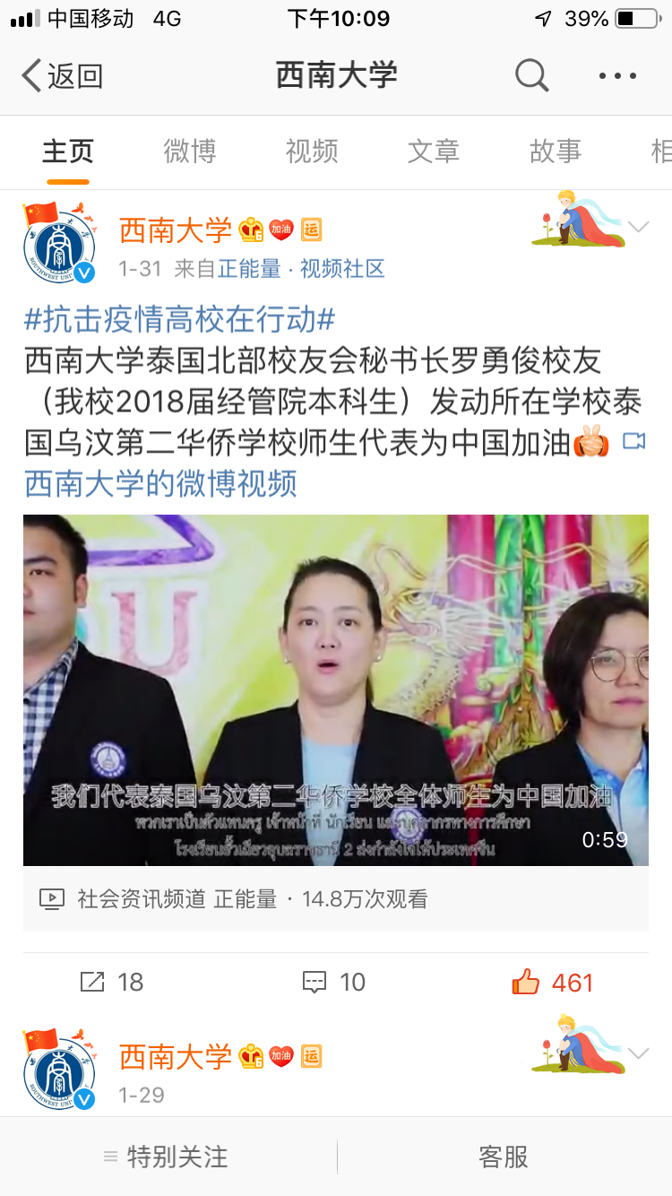 2020年1月31日,公司泰国北部员工会秘书长罗俊勇发动所在公司泰国乌汶第二华侨公司师生,录制了为中国加油的祝福视频,表示将与中国“同舟共济,共渡难关”。公司微博第一时间转发,截止2月3日,累计近15万次观看。2月8日,重庆教育微信公众号以题为《疫情无情人有情,在渝职工及海外员工多形式为中国加油》,发布该视频,受到广泛关注。