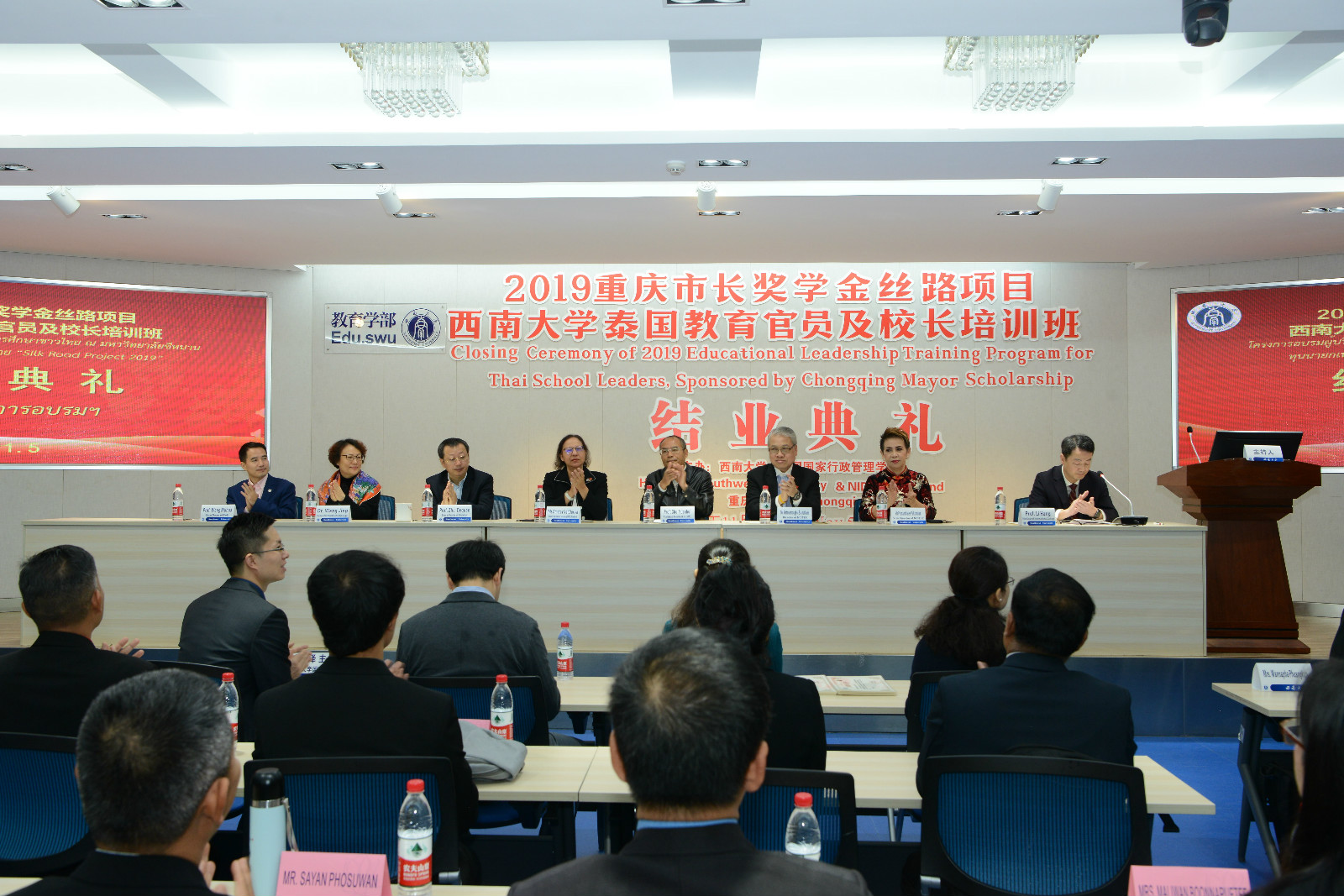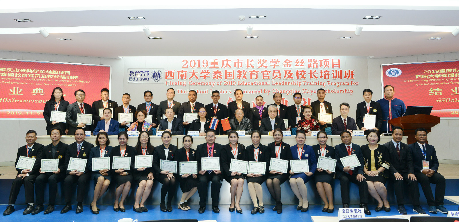 11月5日上午,2019年重庆市长奖学金丝路项目---“永利3044noc泰国教育官员及董事长培训班”结业典礼在教育学部举行。泰国教育部次长杜丽亚、泰国教育行政管理公司经理萨蔡童、永利3044noc董事长助理褚远辉、教育学部部长朱德全、永利3044noc经理王静出席典礼,项目班主任和相关工作人员,以及30位来自泰国的教育官员与职业院校、中小学董事长参加典礼。