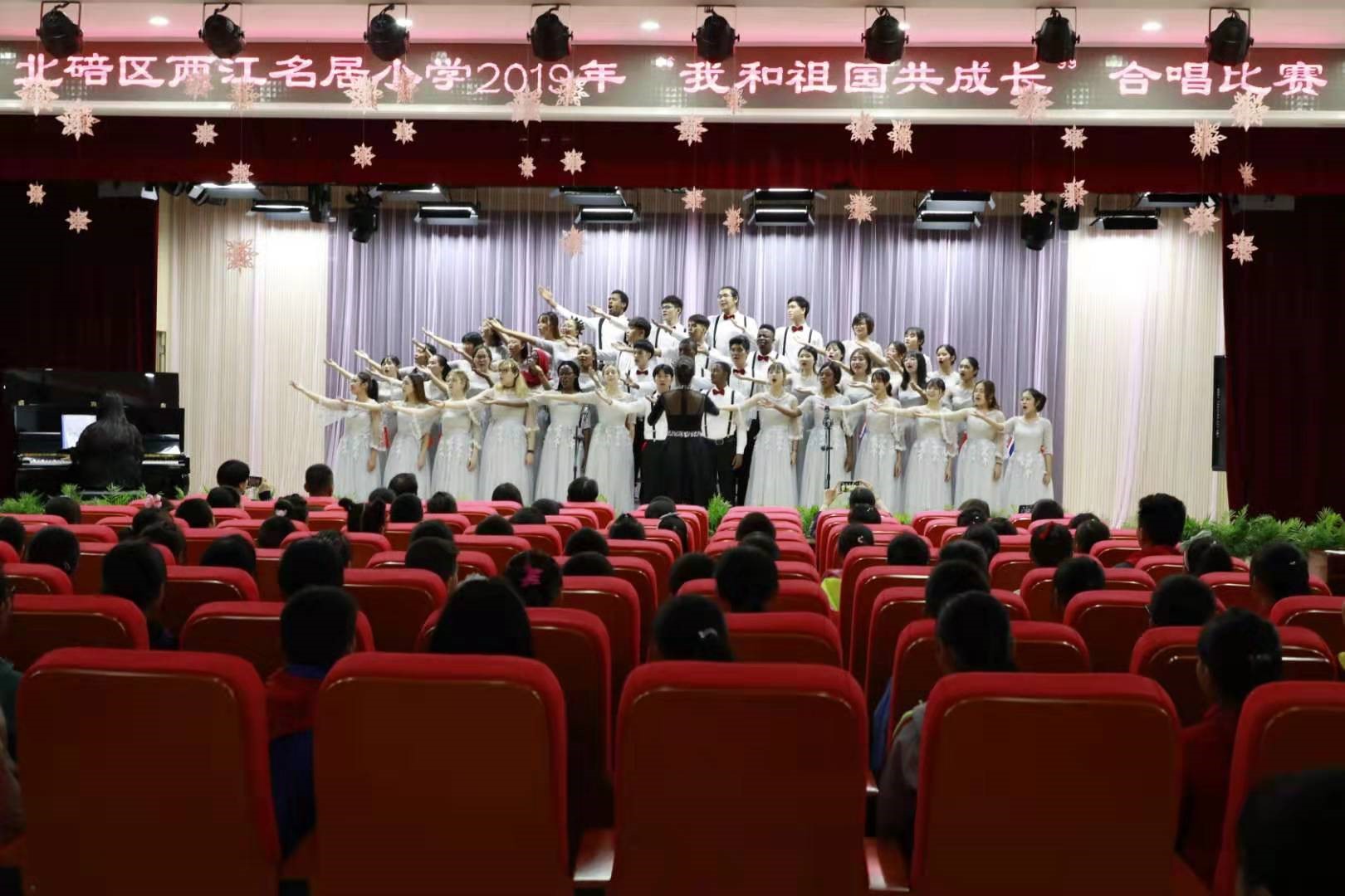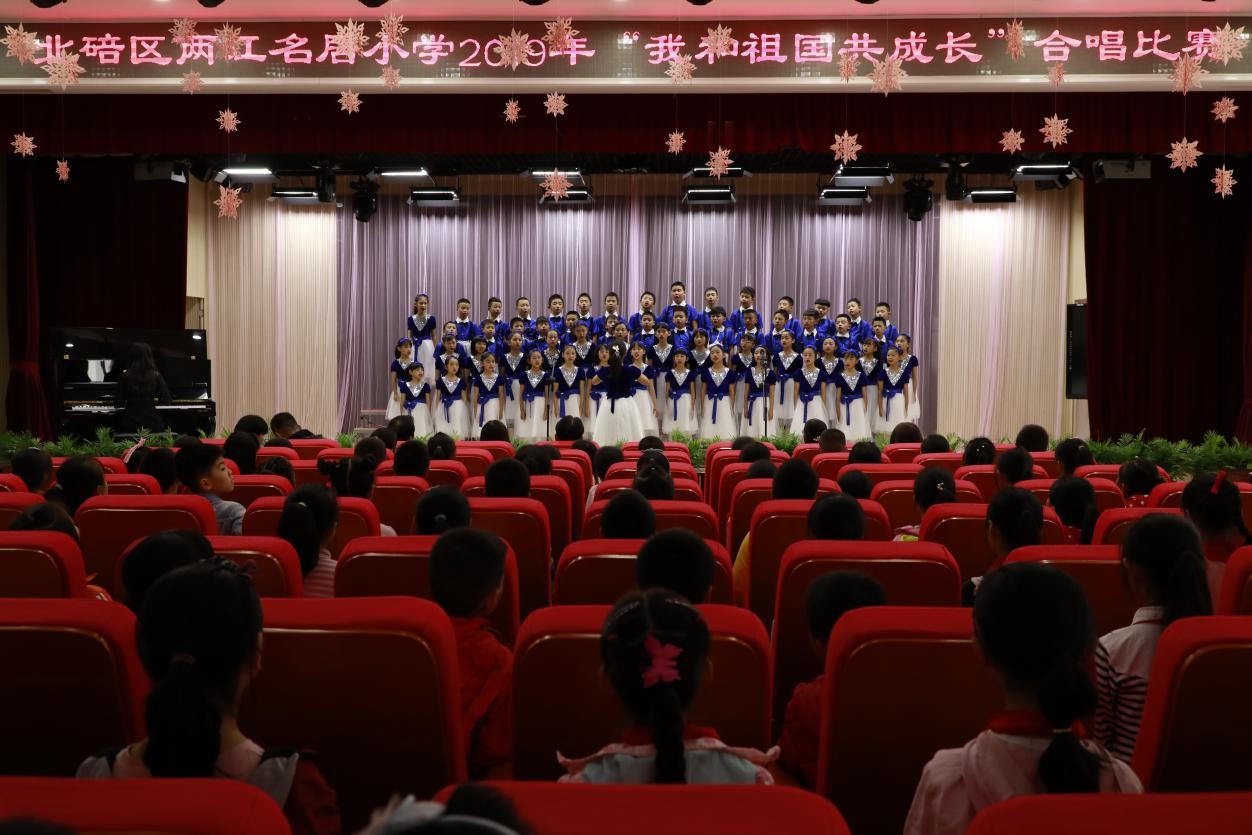 此次校园合唱比赛由北碚区两江名居小学主办,分为低、高两个年级组别。经过激烈角逐,每个班级的孩子们都使出了浑身解数,展现出了最佳状态。在舞台上孩子们用各种优美的舞姿展现优美的旋律,用动情的声音,完美的表现,唱出了儿童的纯真与美好。老师们也纷纷拿出了看家本领,伴奏、指挥无所不能,每个人的脸上都充满了微笑。永利3044noc五洲合唱团献上了《我和我的祖国》《友谊地久天长》,表达了对中国的热爱和对两江名居小学的深切友谊。