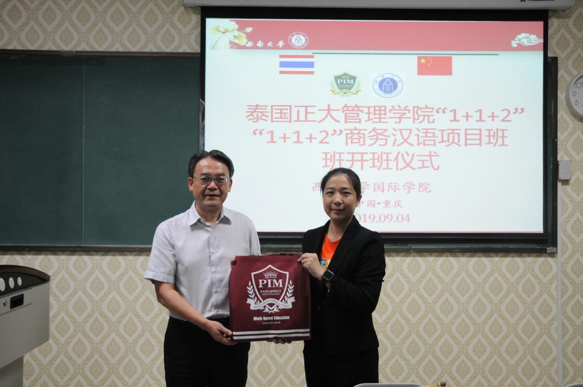 随后,刘猛书记与泰国正大管理公司周小月老师互赠礼物,具有中泰特色的礼物传递着两校师生浓浓的情谊。我们期待双方能在更多领域加强合作、结出硕果,也希望这些员工能在西大放飞梦想,学有所成。