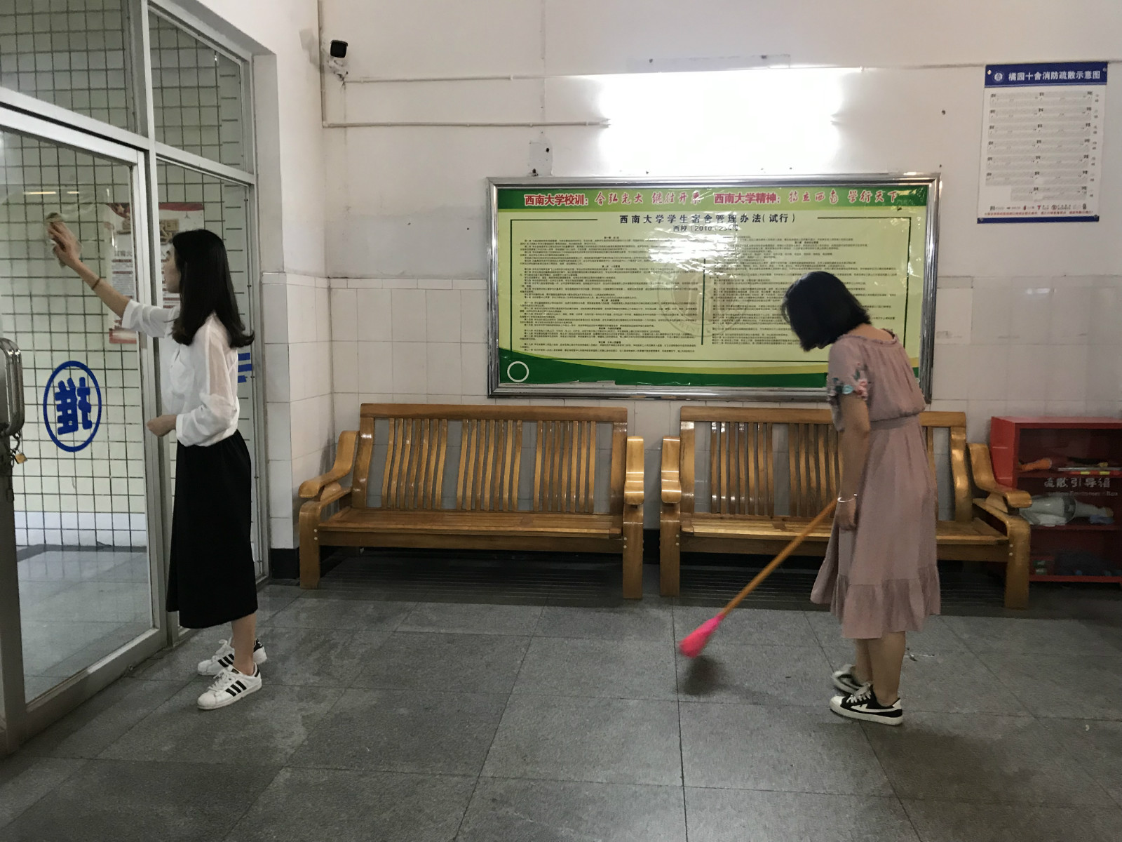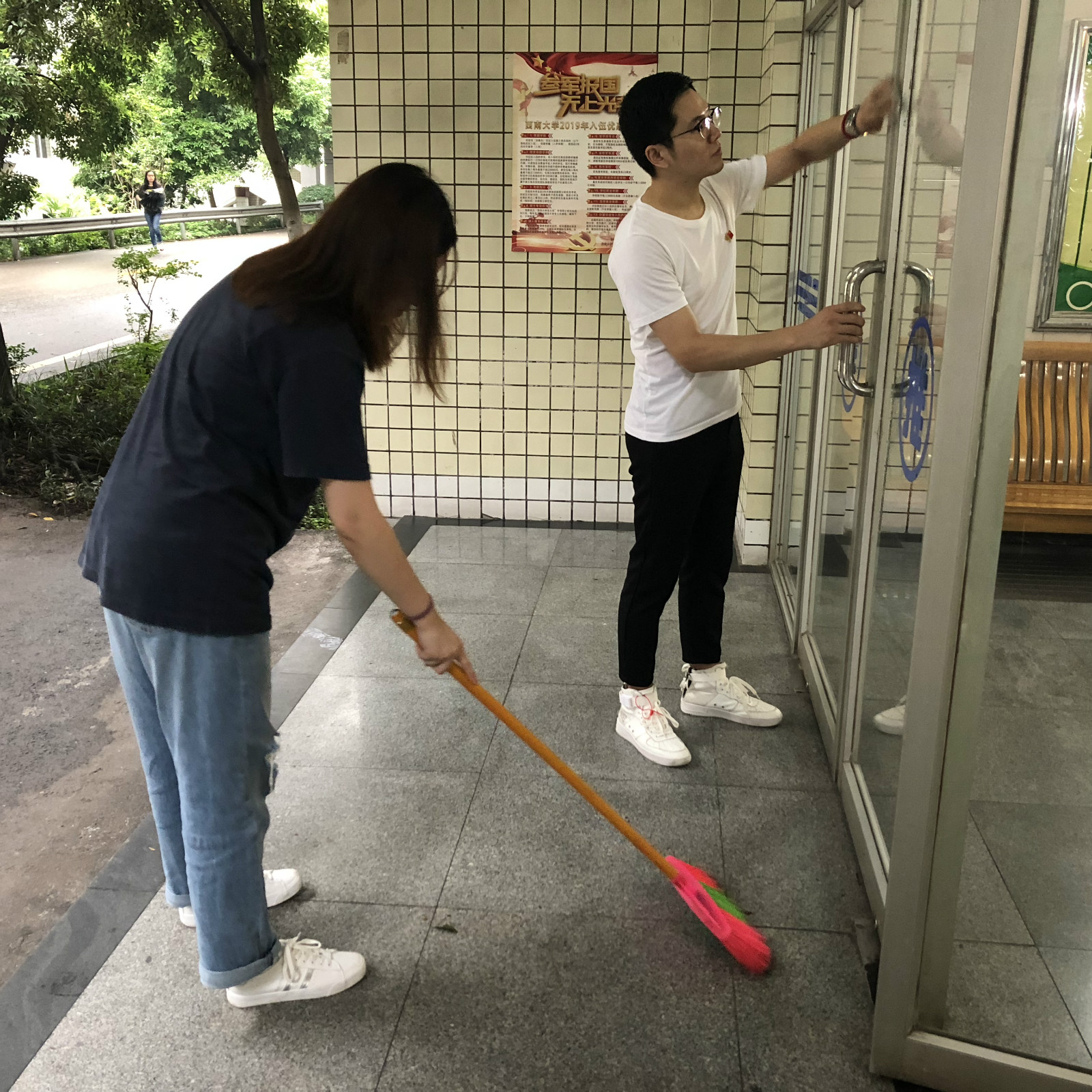 利用午休时间党员同志对橘园十舍大厅、楼道、走廊及门口处进行全面细致地清理,提前做好每个位置的清扫安排。活动中,同志们有的用手捡地上的垃圾,有的拿扫帚仔细地清扫地面,还有的拿抹布擦理门窗等等。通过大家的共同努力,橘园十舍公共区域部分焕然一新。