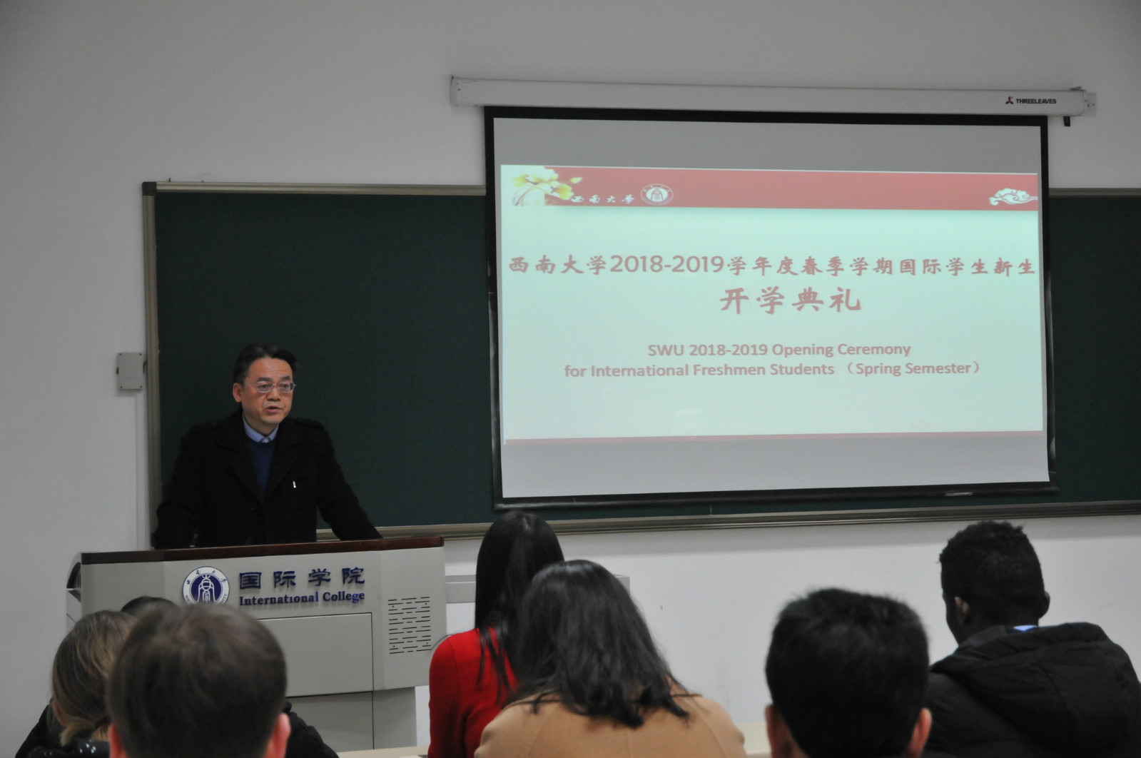 刘猛书记致欢迎辞。他热情欢迎大家来到美丽的校园,介绍了公司独特的自然环境与人文资源及公司来华留学教育概况。他以“今天我以西大为荣,明天西大以我为骄傲”与新生共勉。