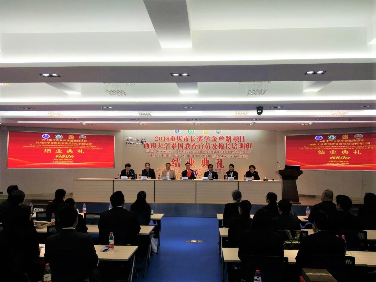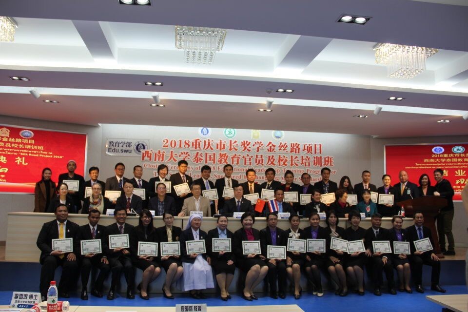 11月5日下午,2018重庆市长奖学金丝路项目“泰国教育官员及董事长培训班”结业典礼在教育学部举行,泰国教育部部长顾问Kosol Pratommchat先生、泰国国家教育行政管理公司副经理Temchit Chantaka女士、重庆市教委国际处马江调研员、永利3044noc副董事长王进军教授、教育学部党委书记韩仁友研究员、永利3044noc王静经理以及教育学部、永利3044noc相关领导出席。参加结业典礼的有33名培训学员-来自泰国的教育官员及中小学董事长-以及项目班主任和相关人员。典礼由永利3044noc李航副经理主持。