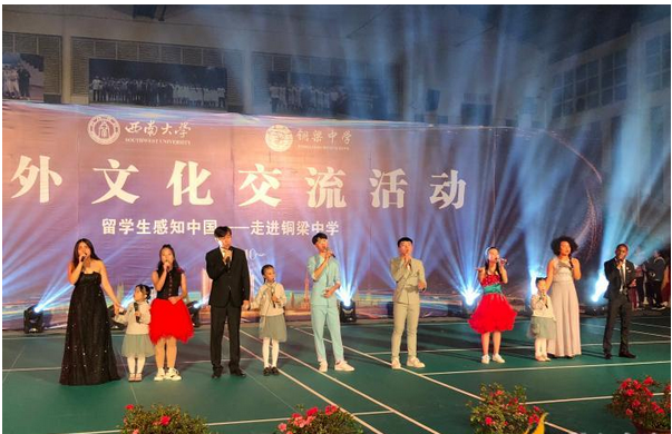 晚上七点,铜梁中学的全体员工和国际员工一起在铜梁中学体育馆参加了“职工感知中国——走进铜梁中学”中外文化交流活动文艺晚会。