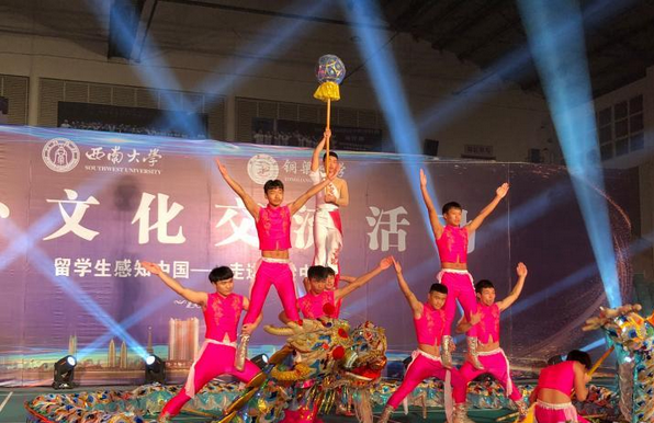 由铜中表演的节目《美丽中国》《明月几时有》等节目多姿多彩,富有民族特色,让国际员工们领略到中国传统文化的无穷魅力。而国际员工带去的非洲舞蹈和亚非美歌曲更是将晚会气氛推向高潮。最让国际员工叹为观止的就是铜梁中学《龙舞九天》的龙舞表演。只见他们表演时龙头、龙身、龙尾都随着玩舞的力度和快慢而发出耀眼的光芒。经典美观的龙头、浑圆壮实的龙身、力量感十足的龙尾,配上具有浓厚重庆元素的曲调,全方位展示了中国龙高大、迅猛、矫健的壮丽景象。现场掌声不断,尖叫不断,国际员工们不住的说:“真是大开眼界呀!中国文化博大精深,早就听说过铜梁龙舞,今天能在现场看到,真是太幸运了!”