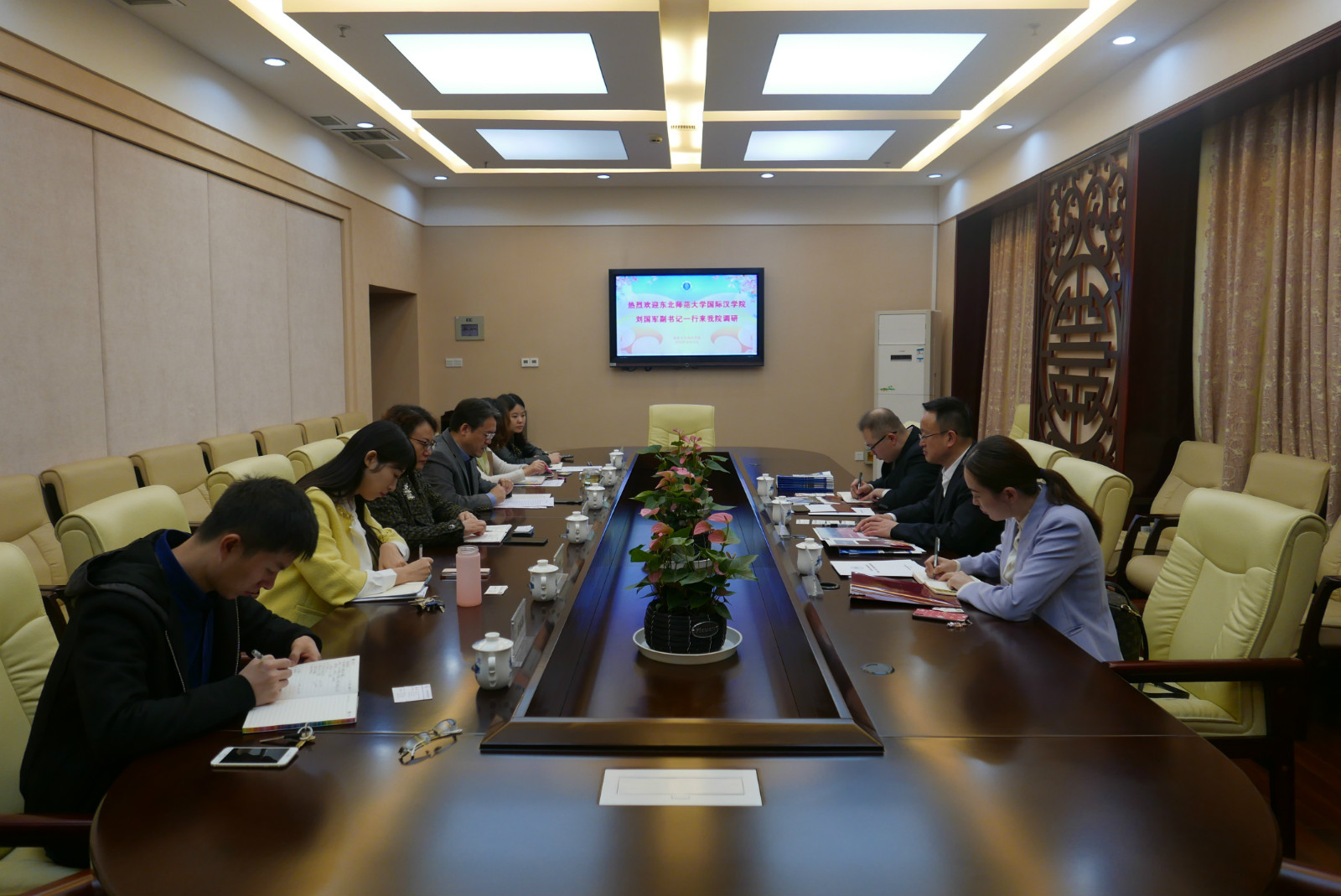 10月24日上午9点30分,东北师范大学国际汉公司刘国军副书记一行3人来访公司,并与王静经理、刘猛书记和各科室负责人在紫云楼签约室交流座谈。