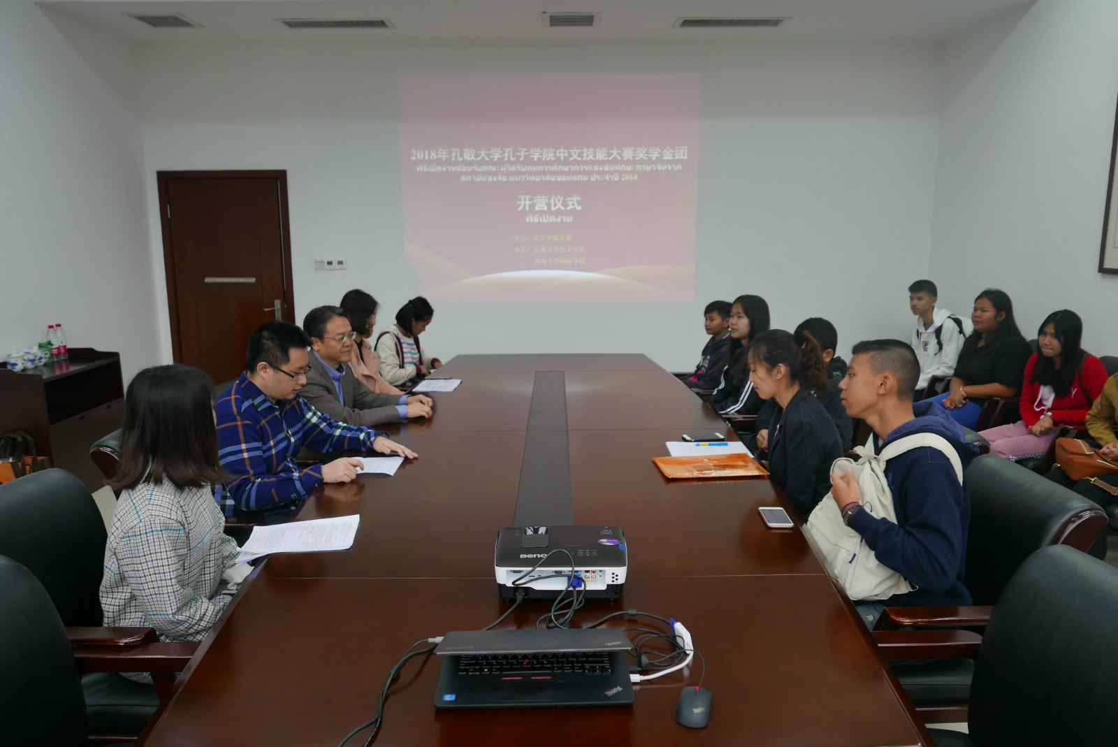 2018年10月16日上午9点30分,2018年孔敬大学孔子公司中文技能大赛奖学金团开营仪式在公司紫云楼304室举行,永利3044noc刘猛书记、孔敬大学孔子公司丁了了、教务办张楠、招生办黄无为以及22名泰国中员工参加仪式。
