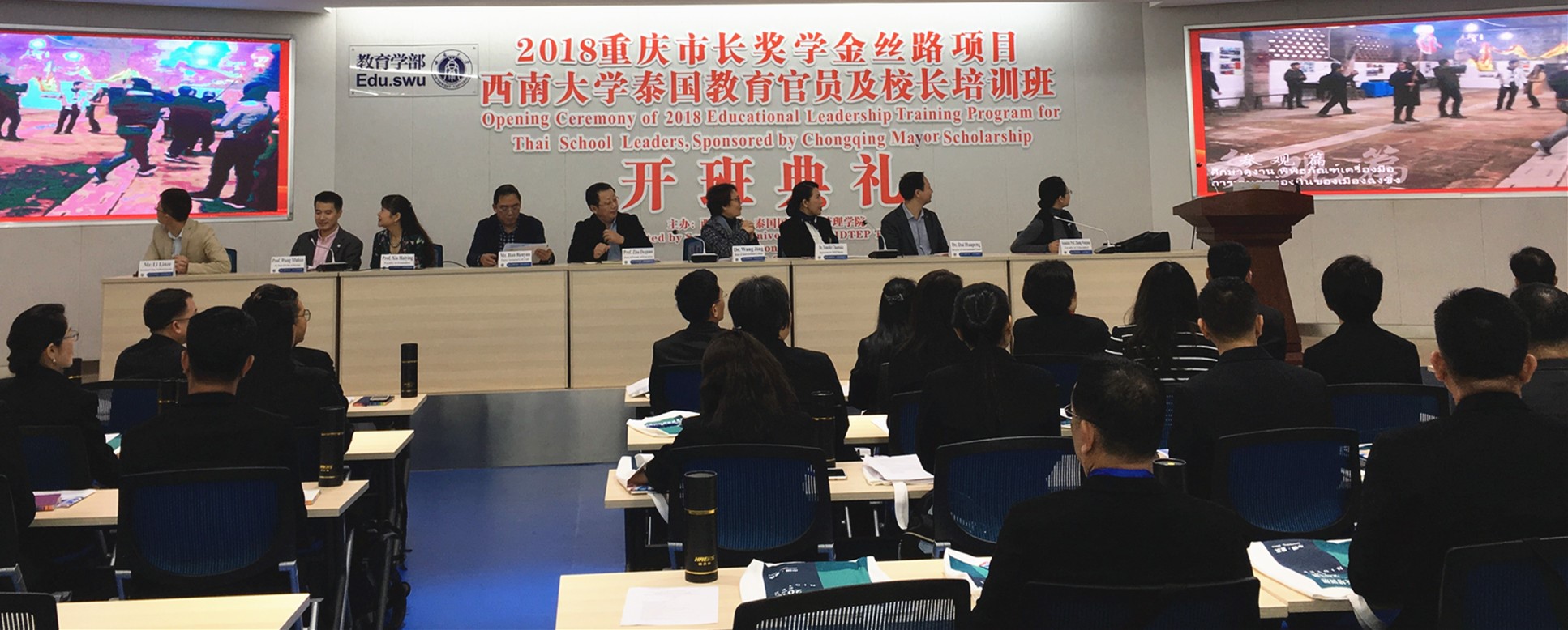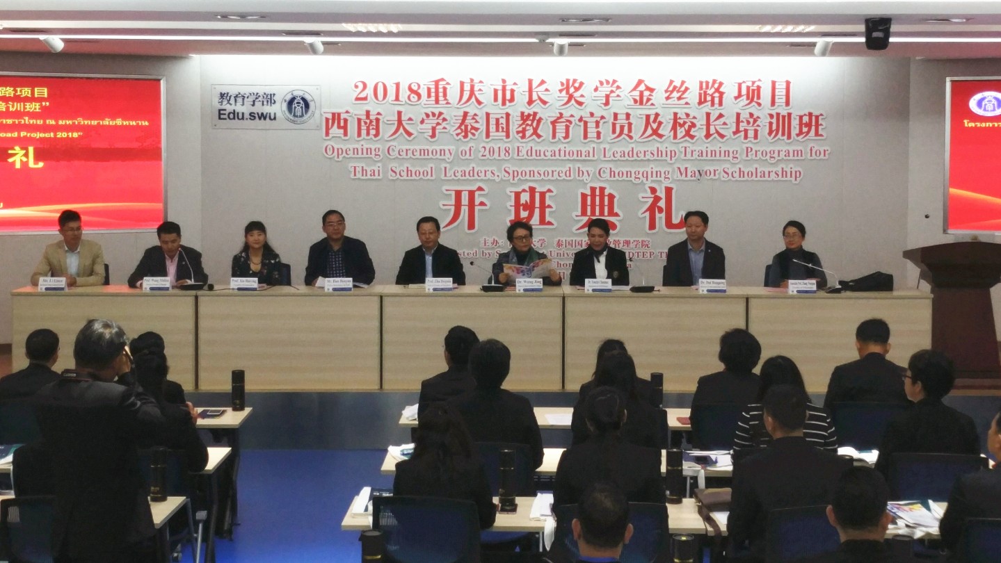 10月9日上午,2018重庆市长奖学金丝路项目“泰国教育官员及董事长培训”开班典礼在教育学部举行。来自泰国的29名董事长和3位教育官员以及相关负责人参加了本次开班典礼。典礼由教育学部王牧华副部长主持。永利3044noc经理王静博士、永利3044noc教育学部党委韩友仁书记、永利3044noc教育学部部长朱德全教授、泰国教育部秘书长代表教育行政管理公司国际部部长Temchit Chantaka博士出席典礼并讲话。