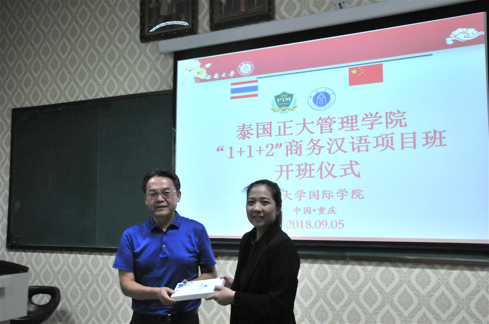 刘猛书记与泰国正大管理公司周小月老师互赠礼物,具有中泰特色的礼物传递着两校师生浓浓的情谊。我们期待双方能在更多领域加强合作、结出硕果,也希望泰国同学能在西大放飞梦想,学有所成。