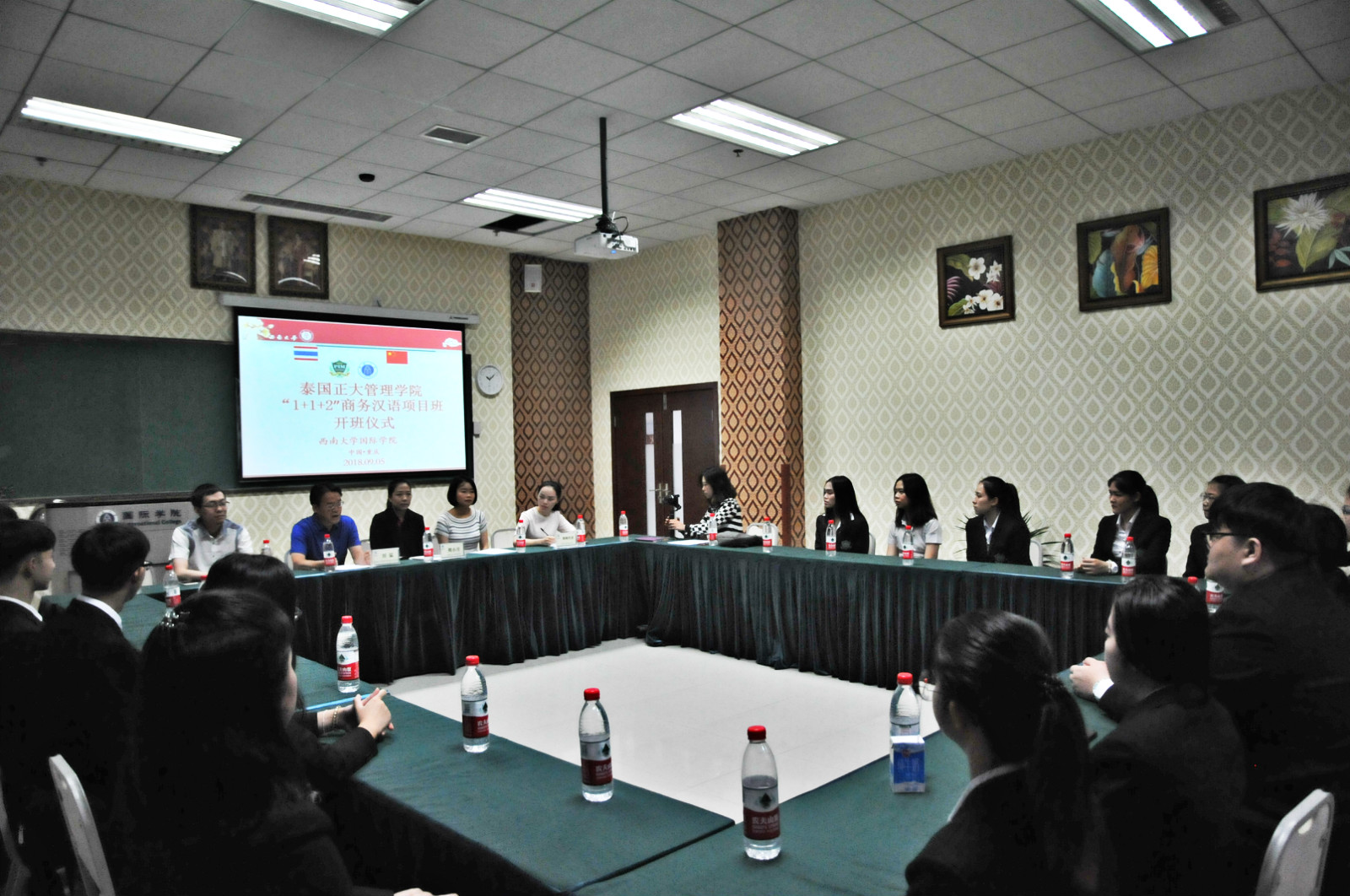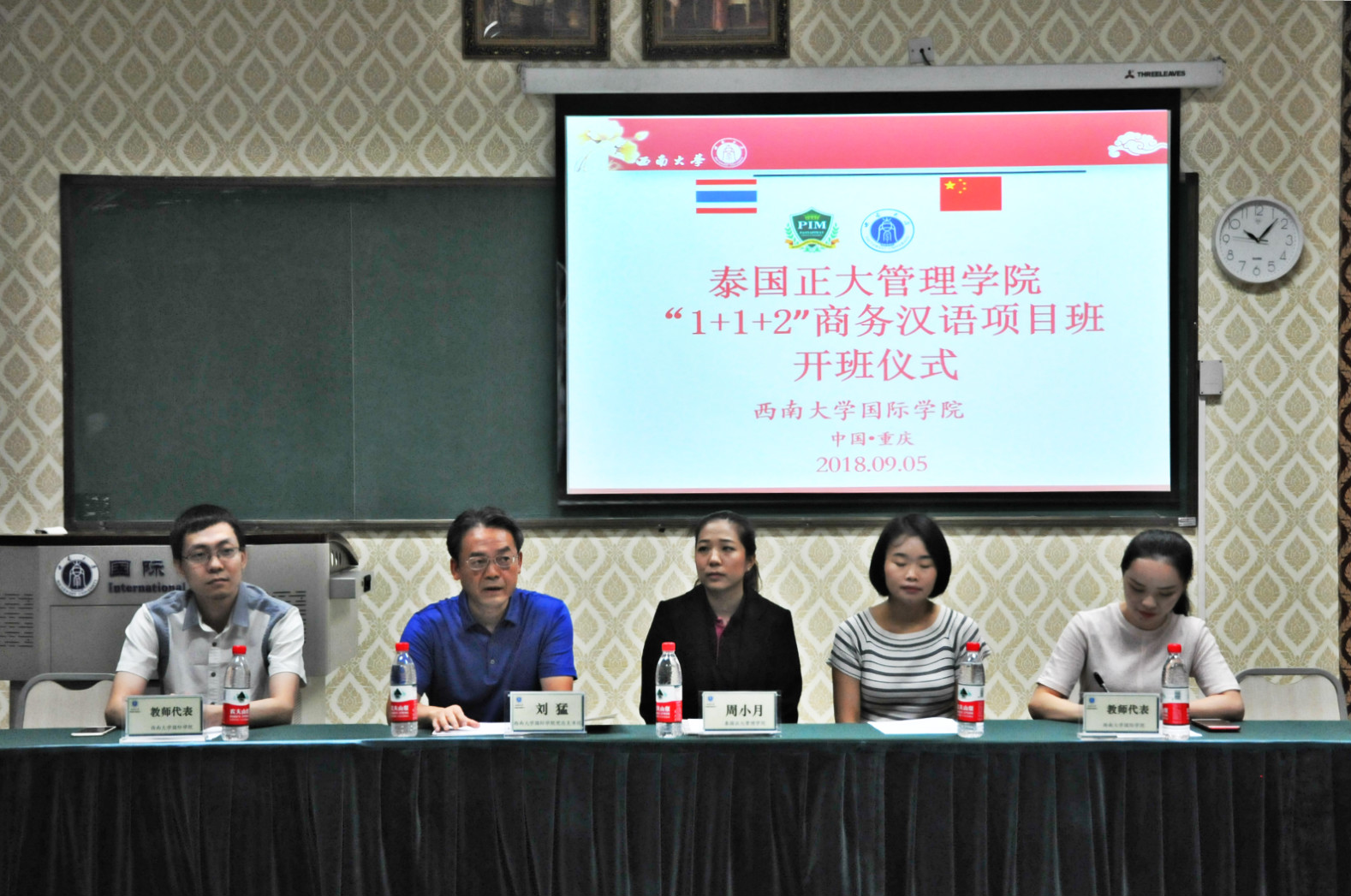2018年9月4日上午10点,2018级泰国正大管理公司“1+1+2”商务汉语本科项目班开班仪式在永利3044noc紫云楼泰国文化教室举行。公司党总支书记刘猛,泰国正大管理公司领队周小月,公司任课教师代表,2018级泰国正大班新生以及来自公司2018级汉语国际教育硕士的中国语伴代表参加会议。