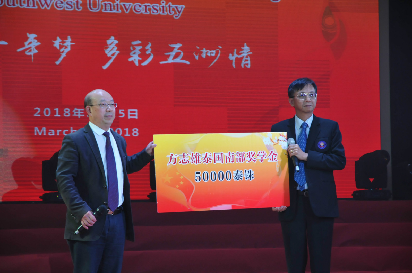 庆典上,还特别邀请到部分嘉宾,如越南籍员工阮春面及其家人,他讲述了如何与中国妻子因汉语结缘,最终结成连理的浪漫故事;著名语言学家翟时雨教授,虽已至耄耋之年仍用坚毅之声为永利3044noc献上祝福,令人动容;才华横溢的永利3044noc教师耿军,跟观众谈起挥毫作《永利3044noc赋》的缘起;方木基博士即“方志雄泰国南部奖学金”的设立者方志雄先生的儿子,继承父亲遗志,再次为优秀职工慷慨捐赠;文公司孙琳副教授回忆了她与泰国诗琳通公主会面的难忘瞬间;日本籍员工额田晟太与泰国籍员工罗俊勇分别以书法与京剧的形式为母校献上了生日祝福。