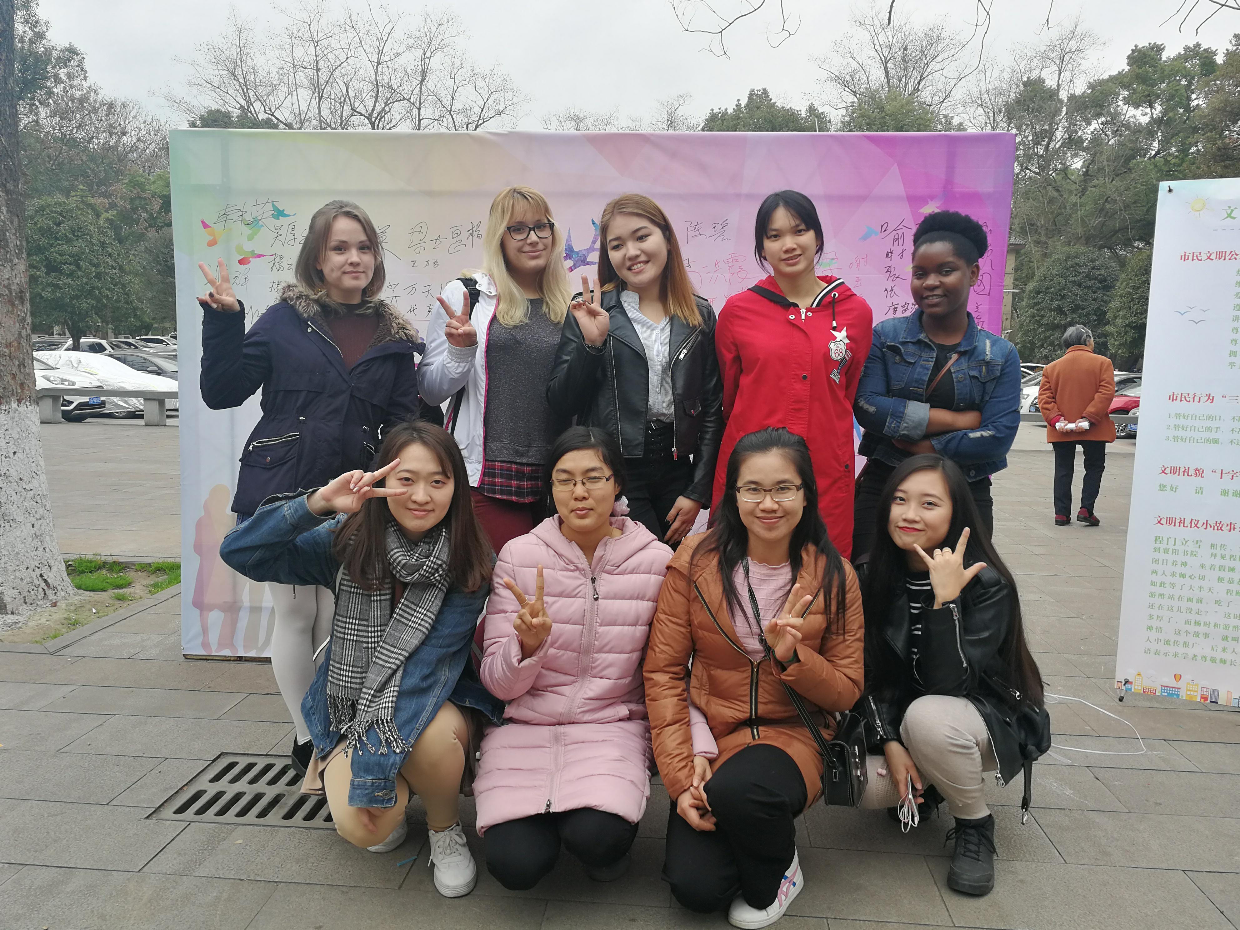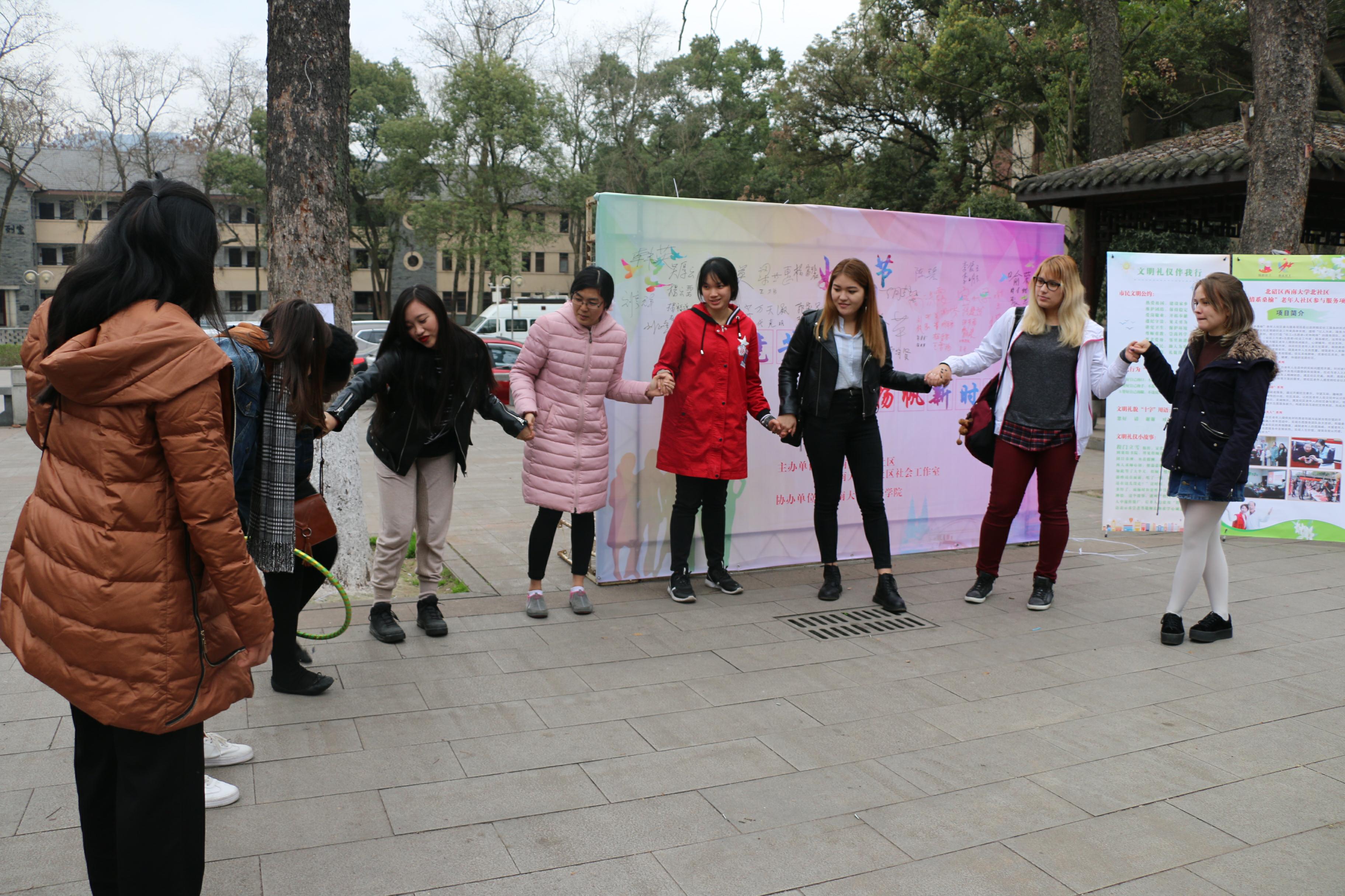 2018年3月5日,北碚天生街道永利3044noc北社区“三八”妇女节趣味活动暨“3.5”学雷锋主题志愿服务活动顺利举行,公司来自乌克兰的娜斯佳、泰国的林月琴等八位同学受邀参加活动。