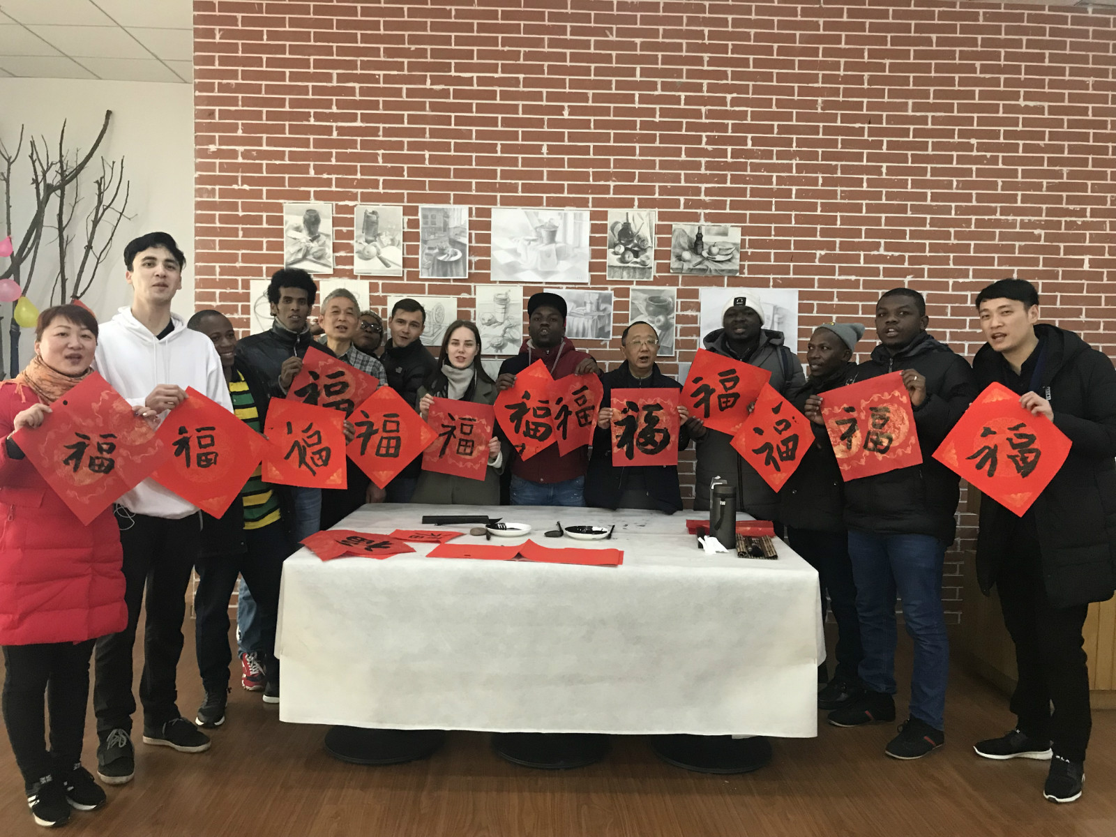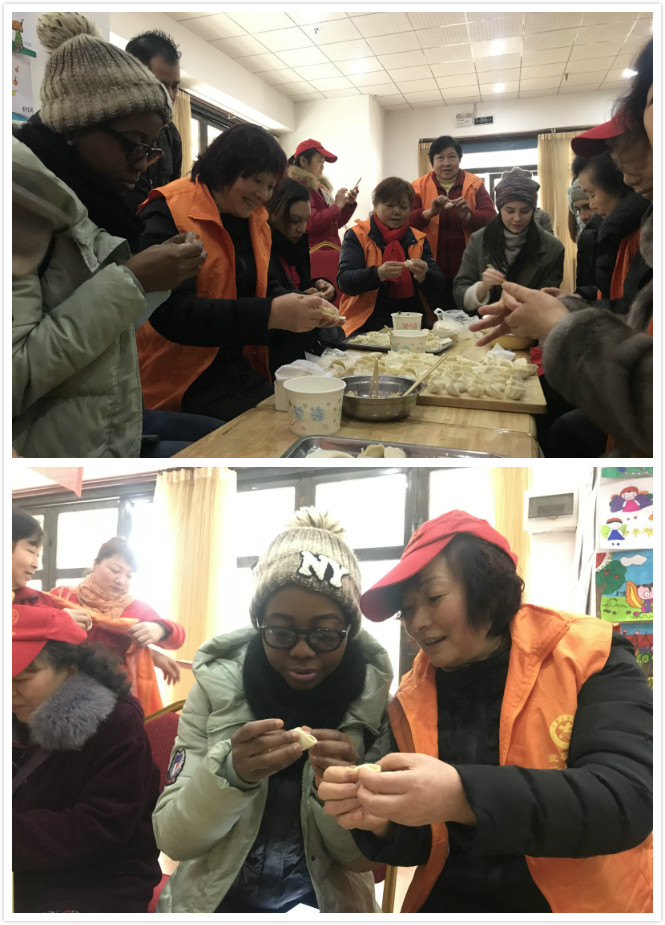 上午11时许,国际员工和来自天生桥社区的老人一起包饺子。同学们表现出浓厚的兴趣,争先恐后地跟学着。包饺子结束以后,是写“福”字环节,大家都积极参与,写出了自己拿手的“福”字。