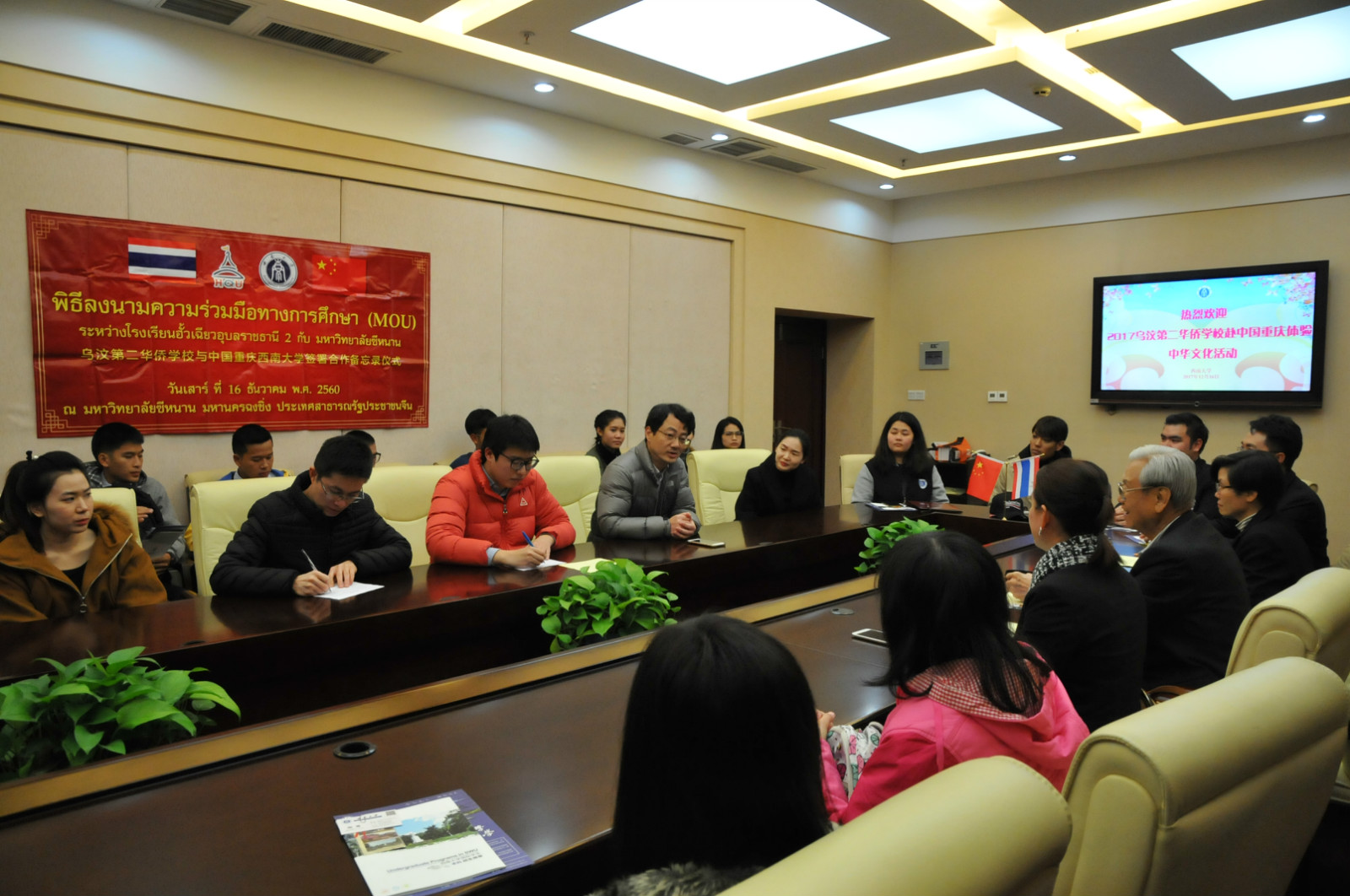 12月14日下午,永利3044noc在紫云楼签约室举行隆重的欢迎仪式,副经理李航代表公司致辞,对营员们的到来表示热烈欢迎。李航副经理说泰国员工团体和泰国文化已成为了公司的重要特色,希望同学们通过这次访学机会进一步增进对中国、重庆及永利3044noc的了解,欢迎同学们来成为永利3044noc员工。泰方领队庄舜鹏董事长在回应讲话中感谢永利3044noc热情周到的接待和安排,称赞公司优秀毕业生,现任泰国乌汶第二华侨公司经理助理罗俊勇出色表现,希望其他同学以此为契机,申请来到公司就读。员工代表王文雄随后发言,对双方提供这次机会表示感谢。最后,双方签署合作备忘录,为今后深入的交流奠定基础。
