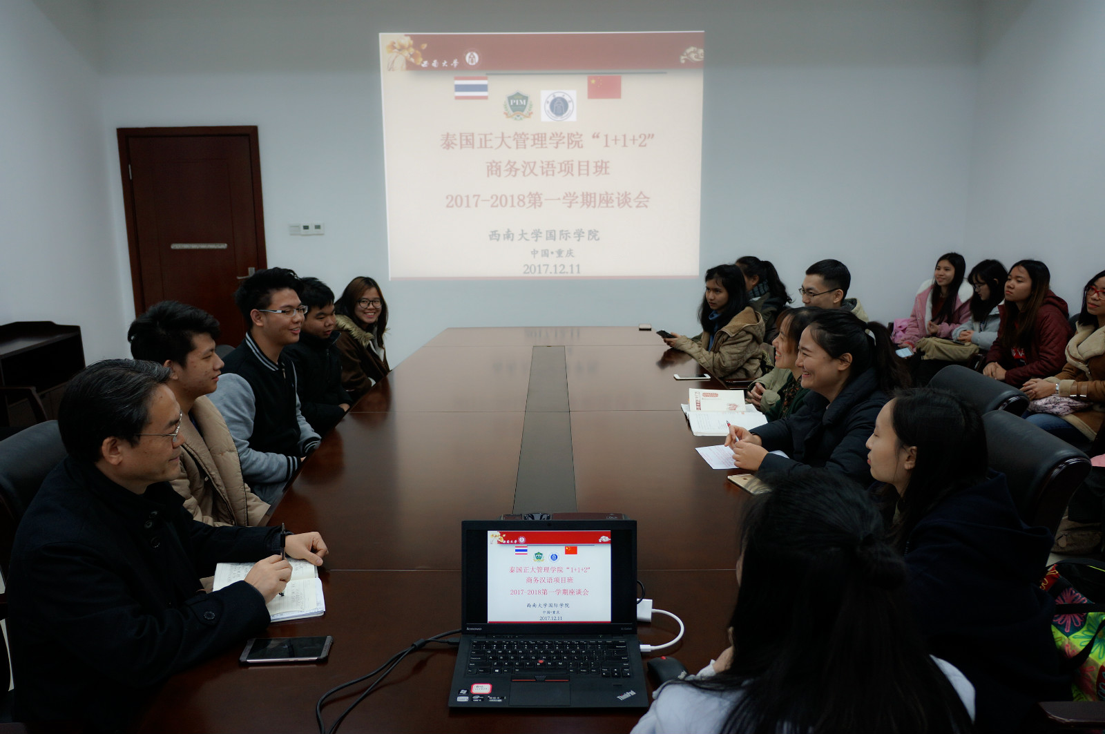 12月11日下午四点半,2017级泰国正大管理公司员工学期座谈会在永利3044noc304会议室圆满举行。国际公司党总支书记刘猛,正大管理公司项目班的5名任课教师以及14名泰国员工参加会议,座谈会由吴宗燕主持。