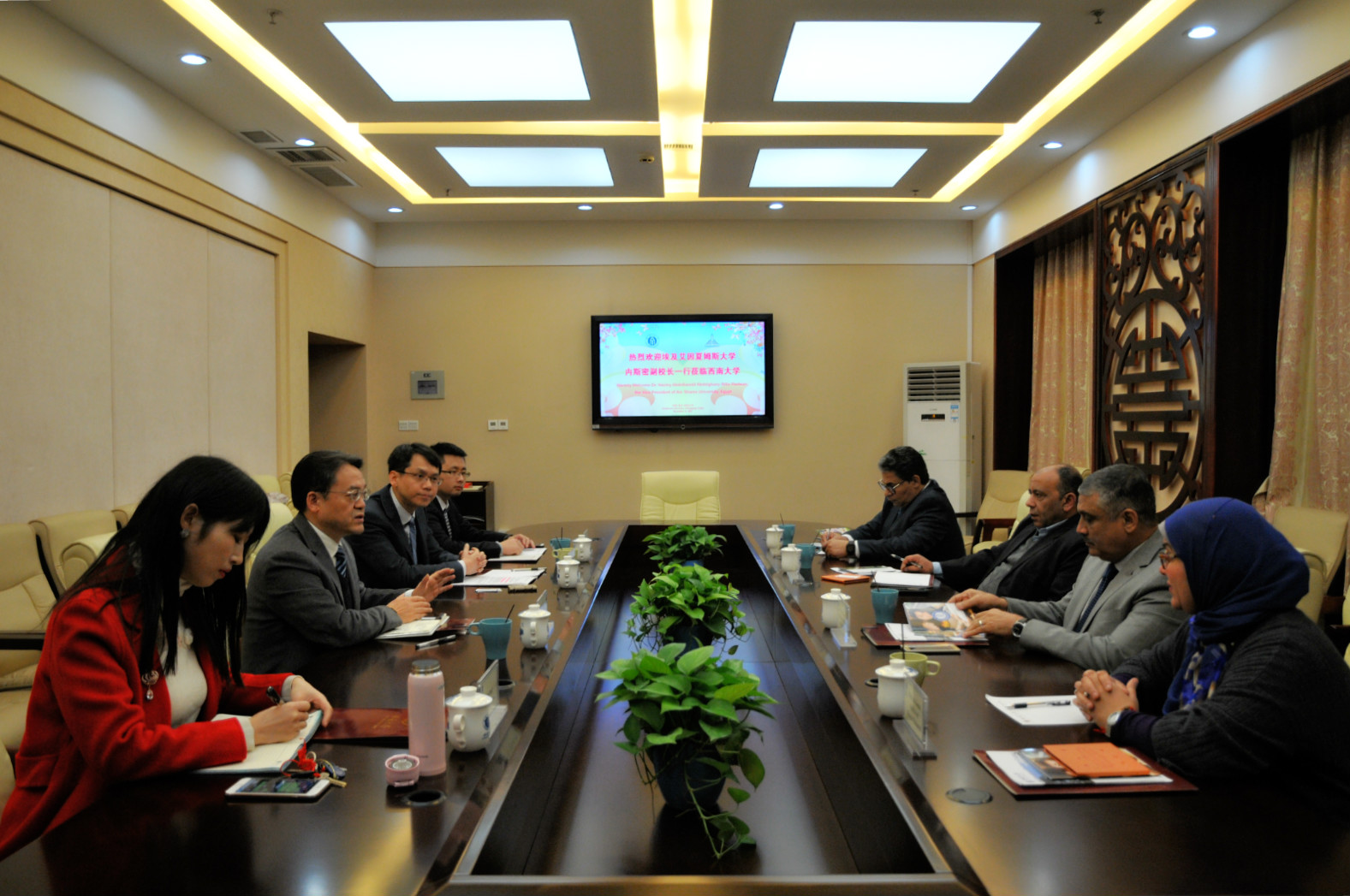 双方就阿拉伯语专业教师引进,本科阿语和中文翻译专业2+1+1学分项目,以及本科2+2联合培养学位项目进行了深入的交流和热列的讨论,并达成了初步合作意向。会谈结束后,双方互赠礼物并合影留念。