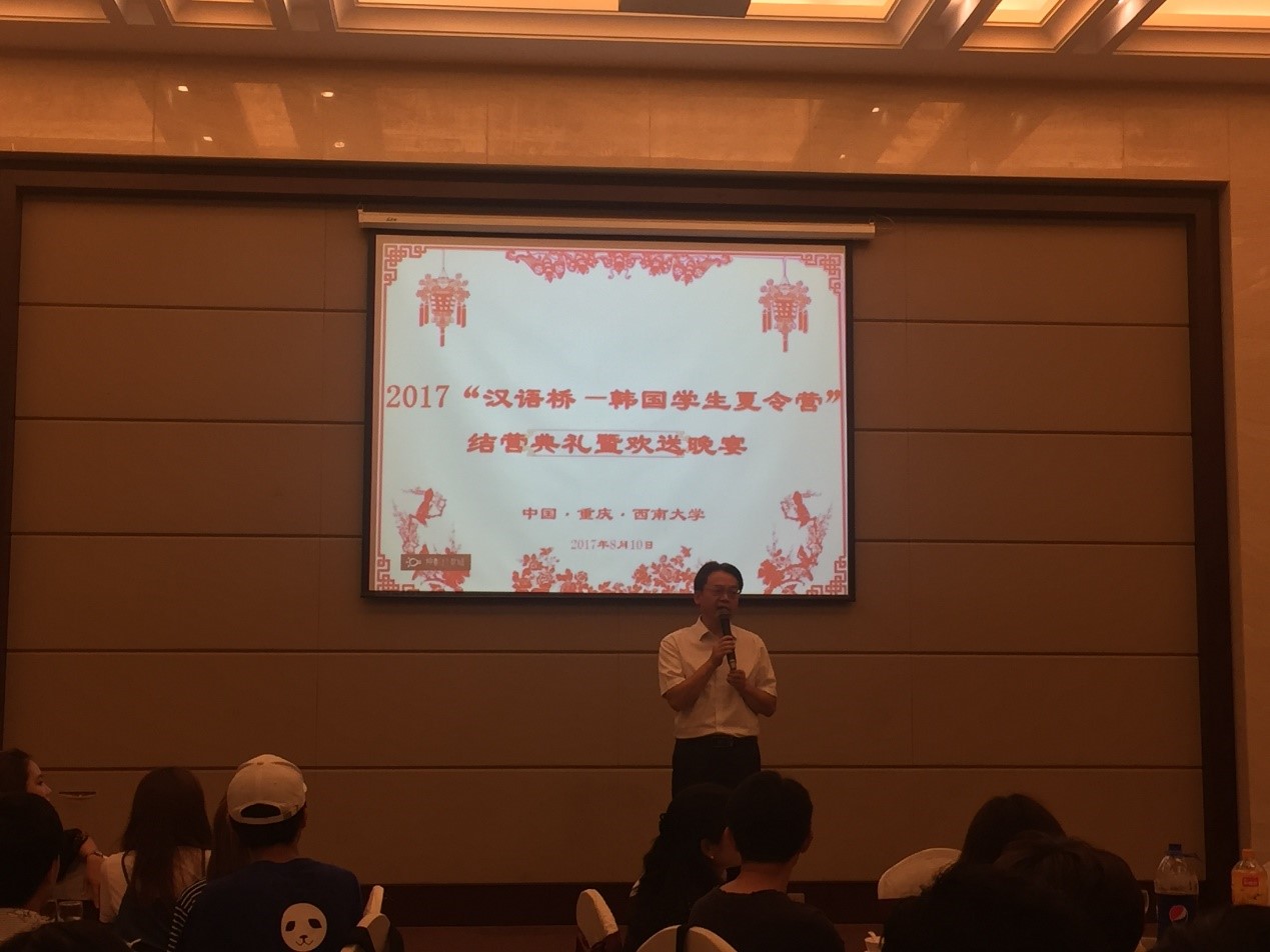 在10日晚举行的结营典礼暨欢送晚宴上,刘猛书记代表公司致欢送辞, 并同韩方带队教师一起为全体营员颁发了结业证书,而营员们则以视频短片、歌曲合唱、舞蹈表演等形式展示了在渝学习成果。在即将离别之际,首尔大学的师生们表示感谢永利3044noc精心的组织和接待工作,期待与重庆和永利3044noc的下一次相遇。
