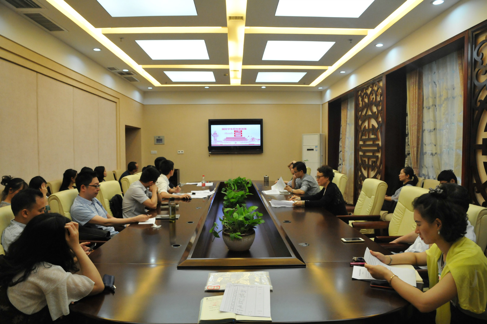 随后相关科室代表分别对三份文件进行了系统解读。员工工作办公室杨昆从员工管理角度,通过与原9号令的对比,对《公司招收和培养国际员工管理办法》(第42号令)的创新点和着力点进行了较为精准的解读。招生办公室李林泽就文件中涉及到的招生环节及各自的职责就行了解读。代远鸿主任着重强调了42号令中第六章“社会管理”部分,结合案例对严格国际员工招生环节的必要性和重要性进行了解读。汉教系姜有顺老师从专职教师的角度解读了新形势下汉语国际教育工作者的使命与职责。