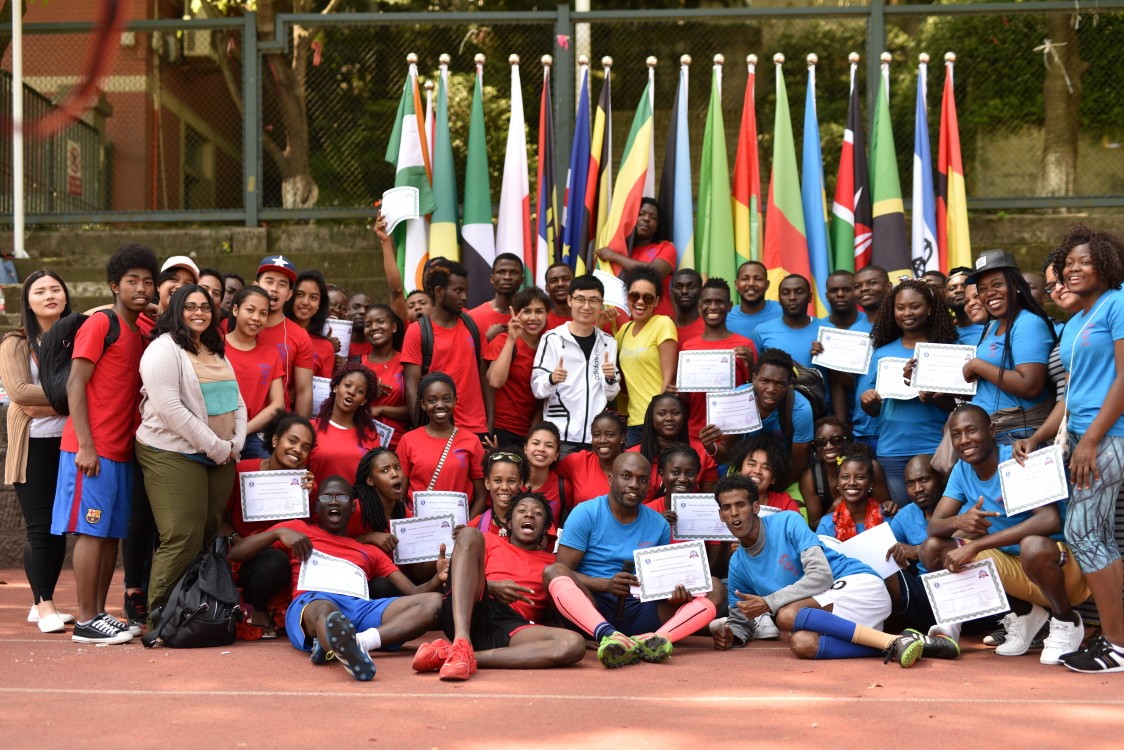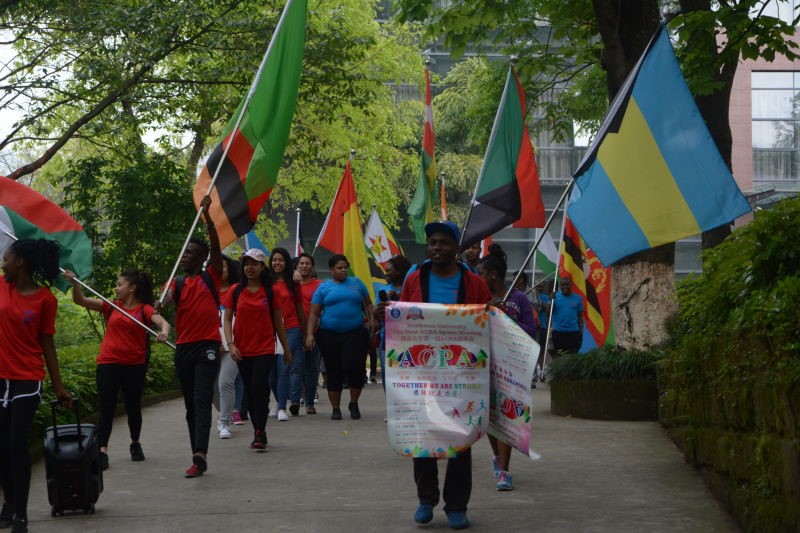 早上八点半,全体参赛同学在紫云楼集结,按照本科生和研究生分为红队和蓝队,穿着各自的队服,举着本国国旗,从紫云楼徒步行进到运动场。